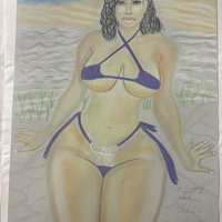 - Woman with short curly black hair sitting on beach wearing a purple bikini with a butterfly embelishment