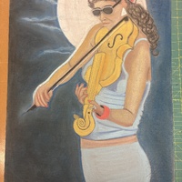 - Woman in a light blue outfit and striped headband playing the violin in front of the moon