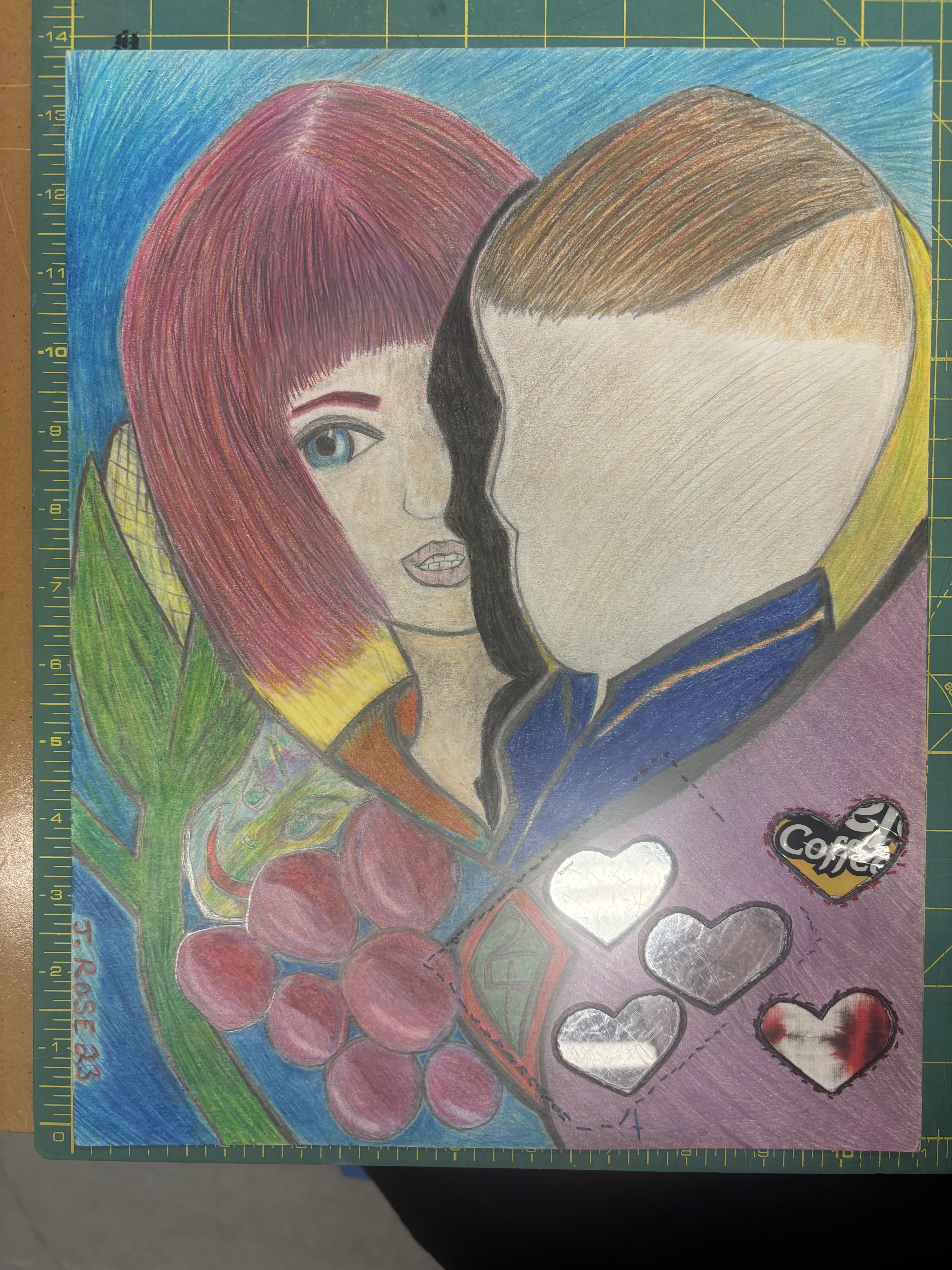 - woman's face and a boy's face making up a heart that is above smaller hearts made of found objects that have been stitched in and are next to corn and grapes