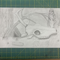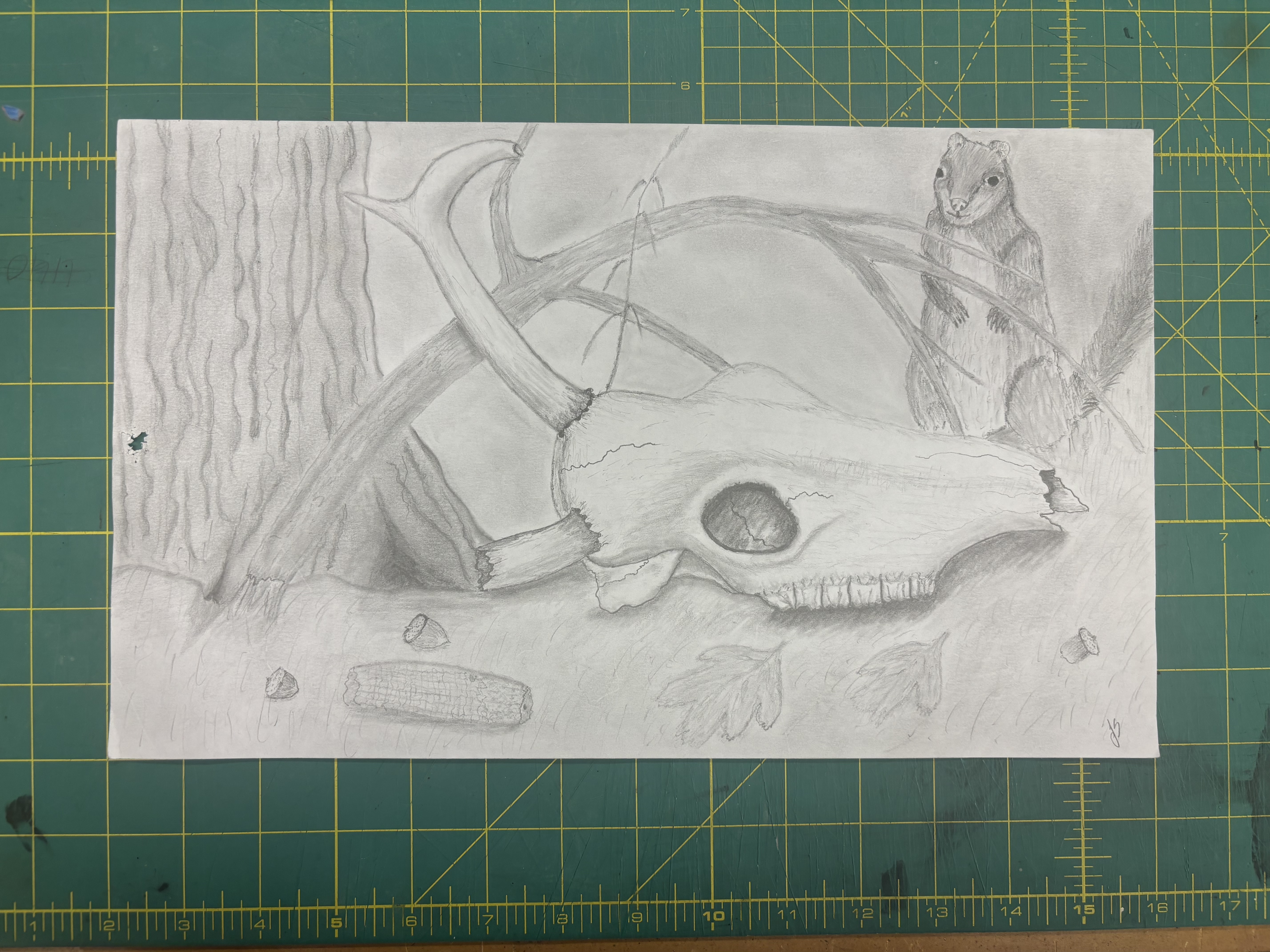 - Deer skull sitting at the bottom of a tree and a squirell in the background