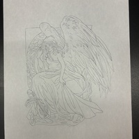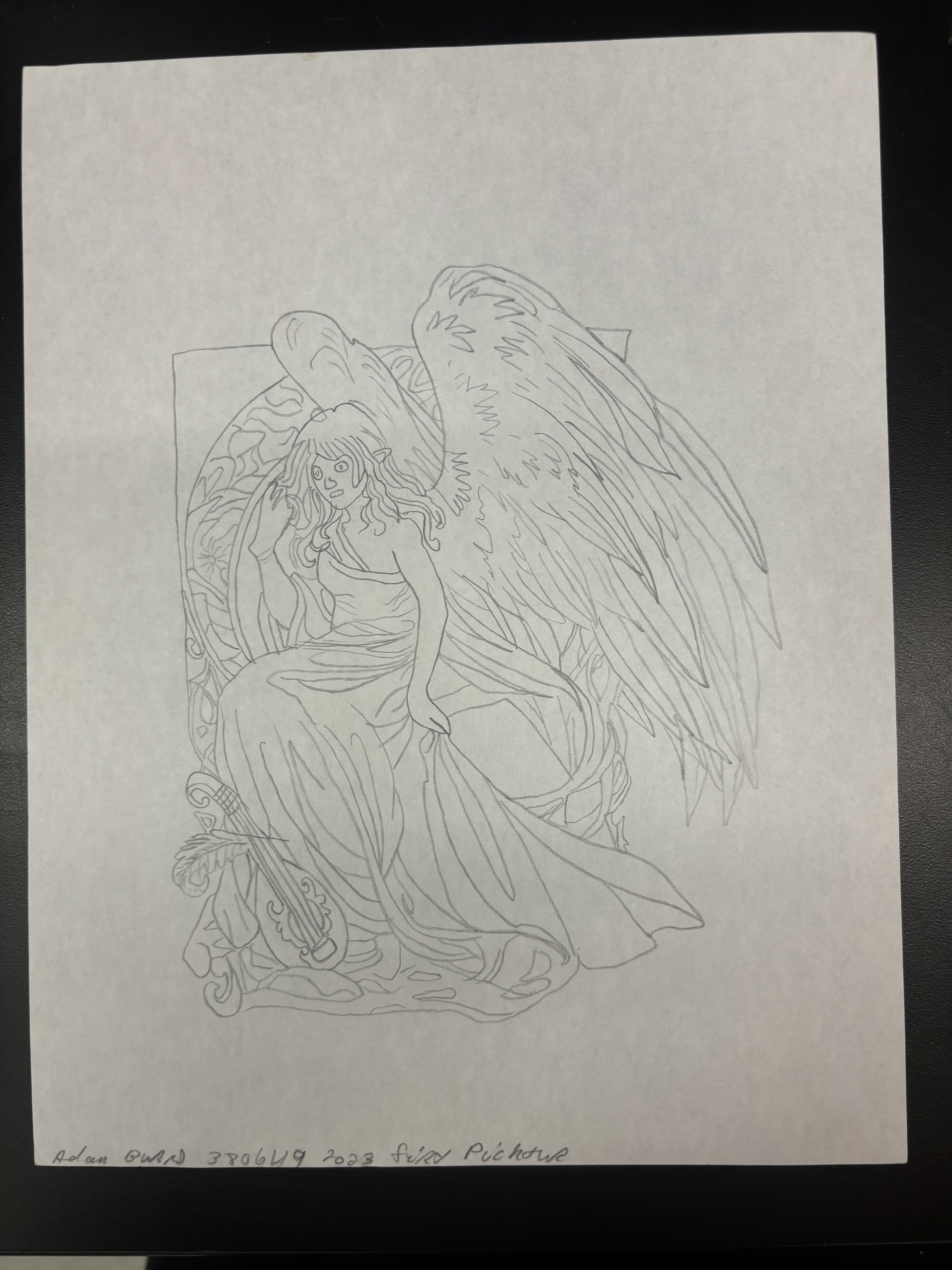 - line drawing of a fairy with angel wings sitting next to a lyre
