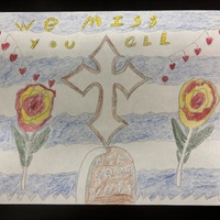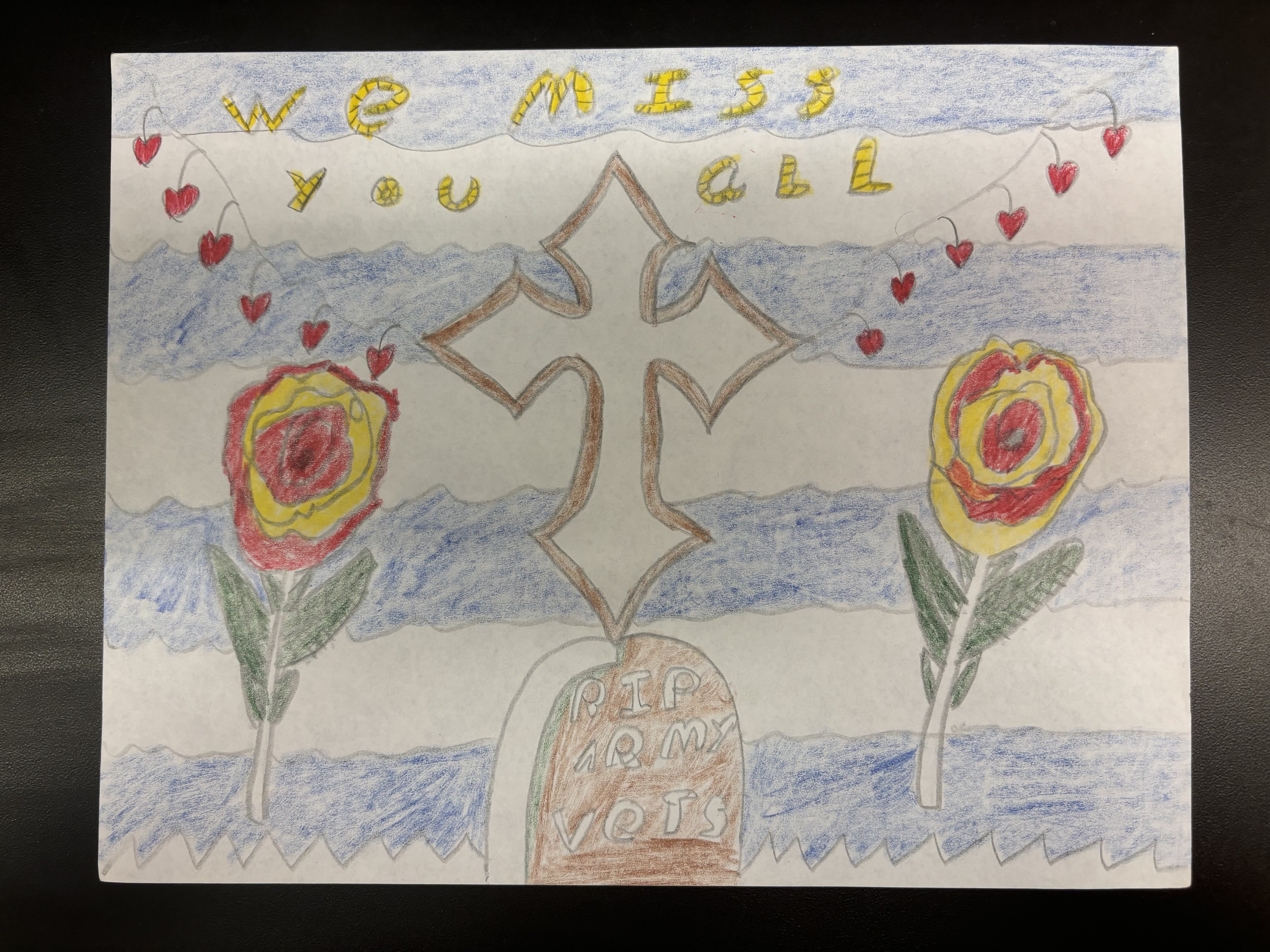 - a cross over a grave saying 'RIP ARMY VETS' and above 'we miss you all' on the left and right two yellow and red flowers