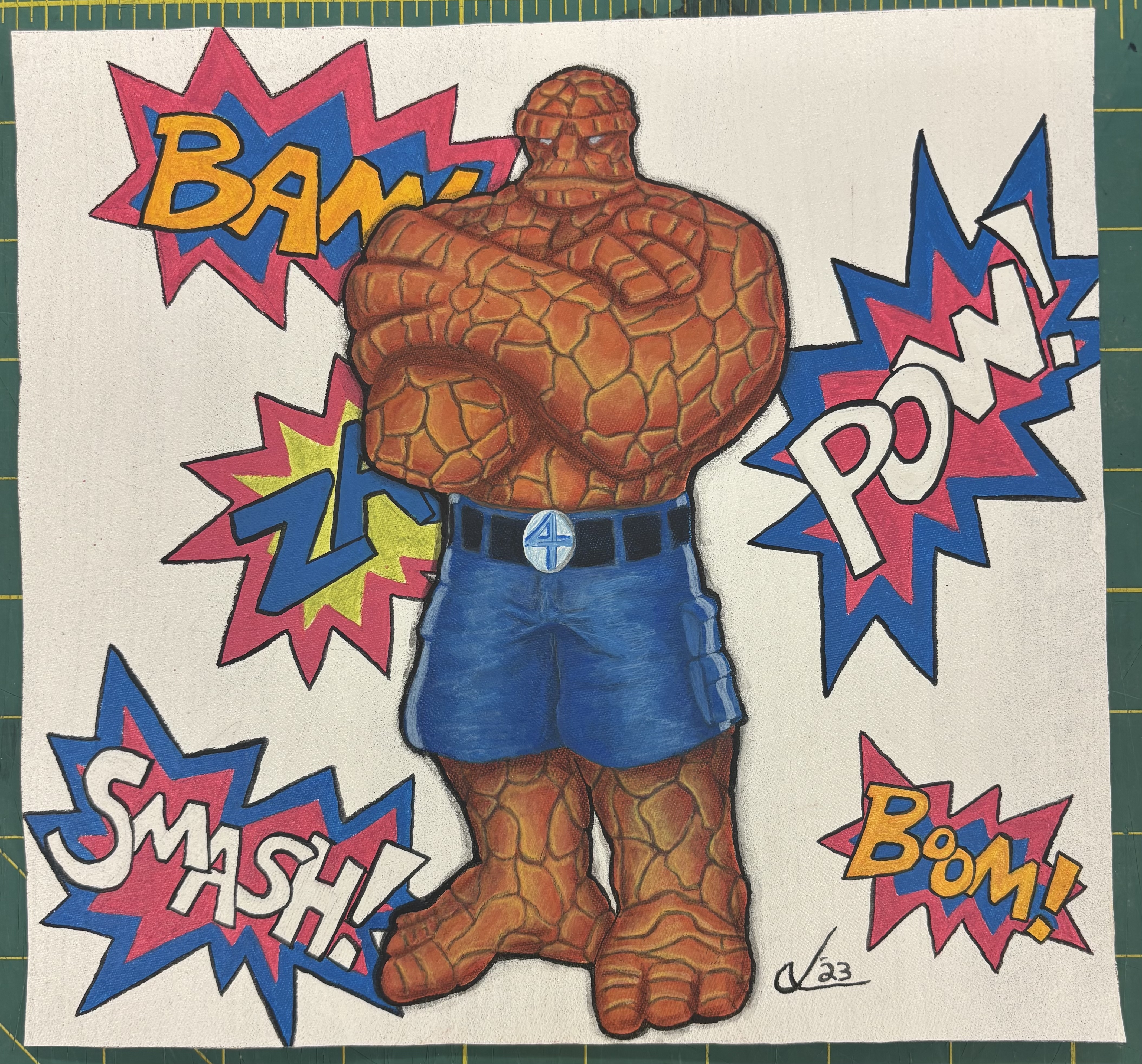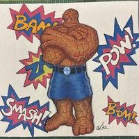 - The Thing standing with his arms crossed in front of different comic book word bubbles