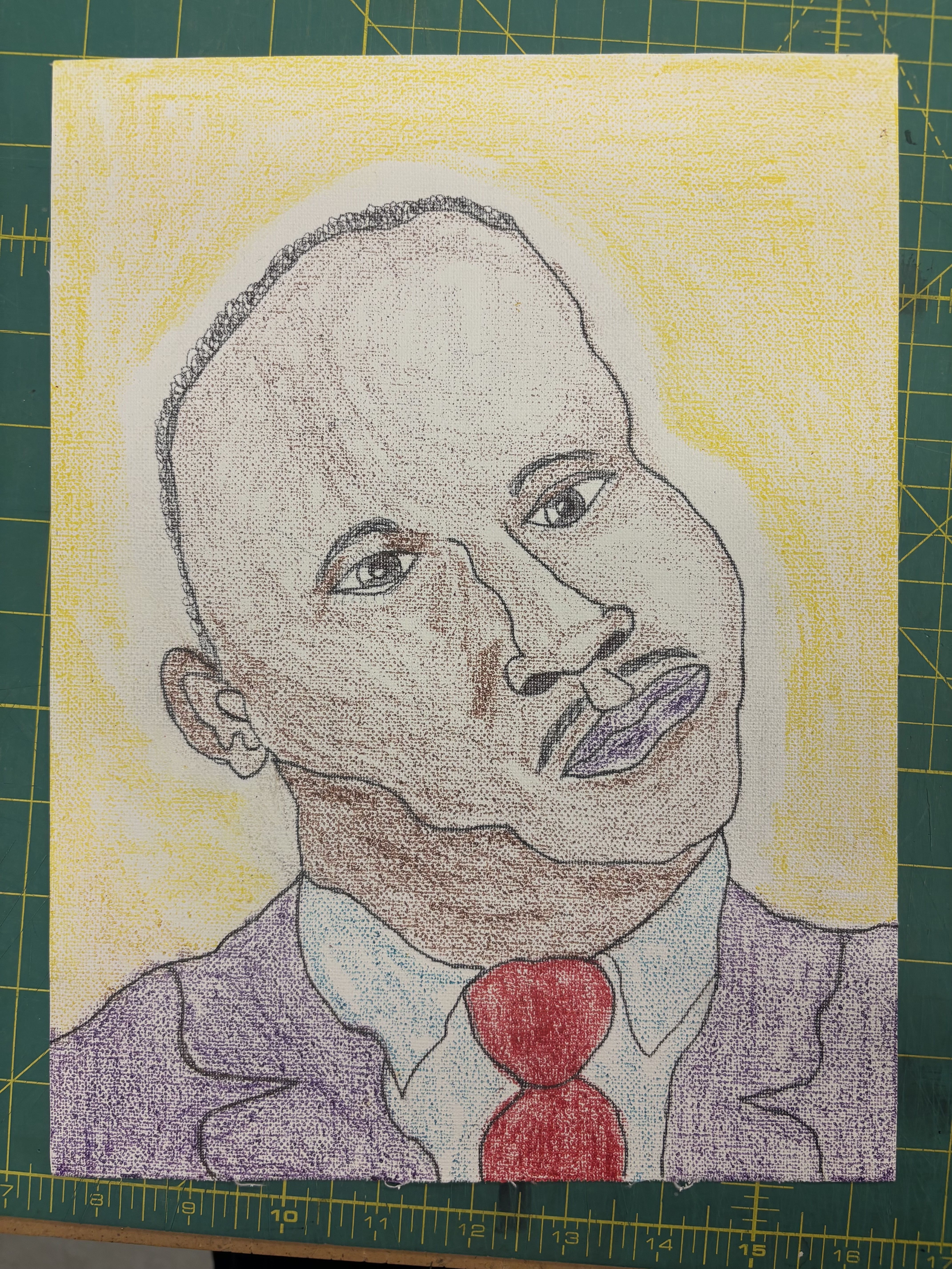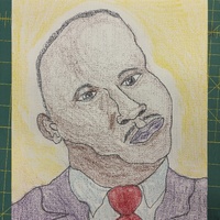 - abstract portrait of a man with a mustache wearing a purple jacket, light blue shirt, and red tie