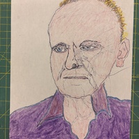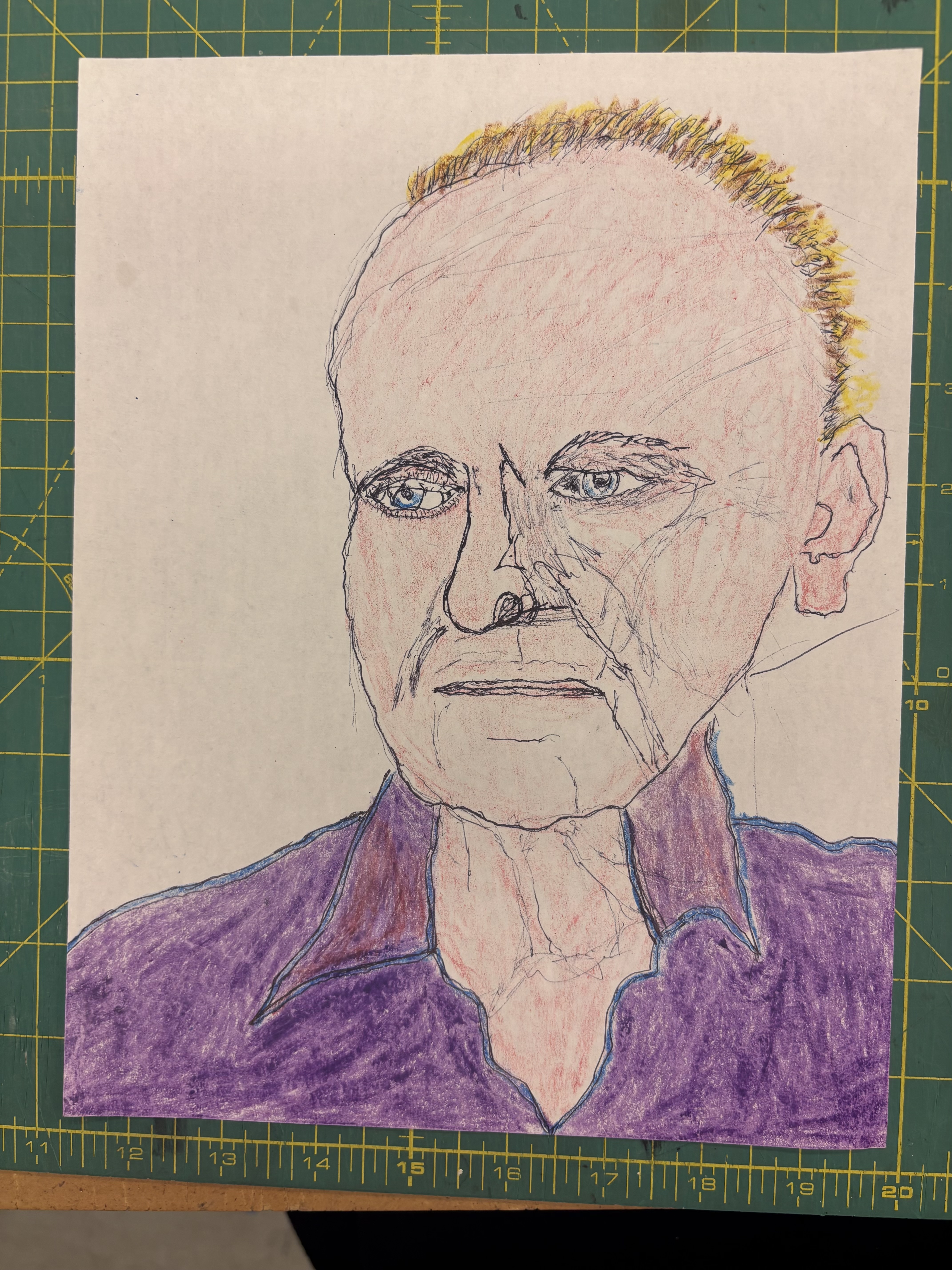 - abstract portrait of a man with short blonde hair and a purple collared shirt