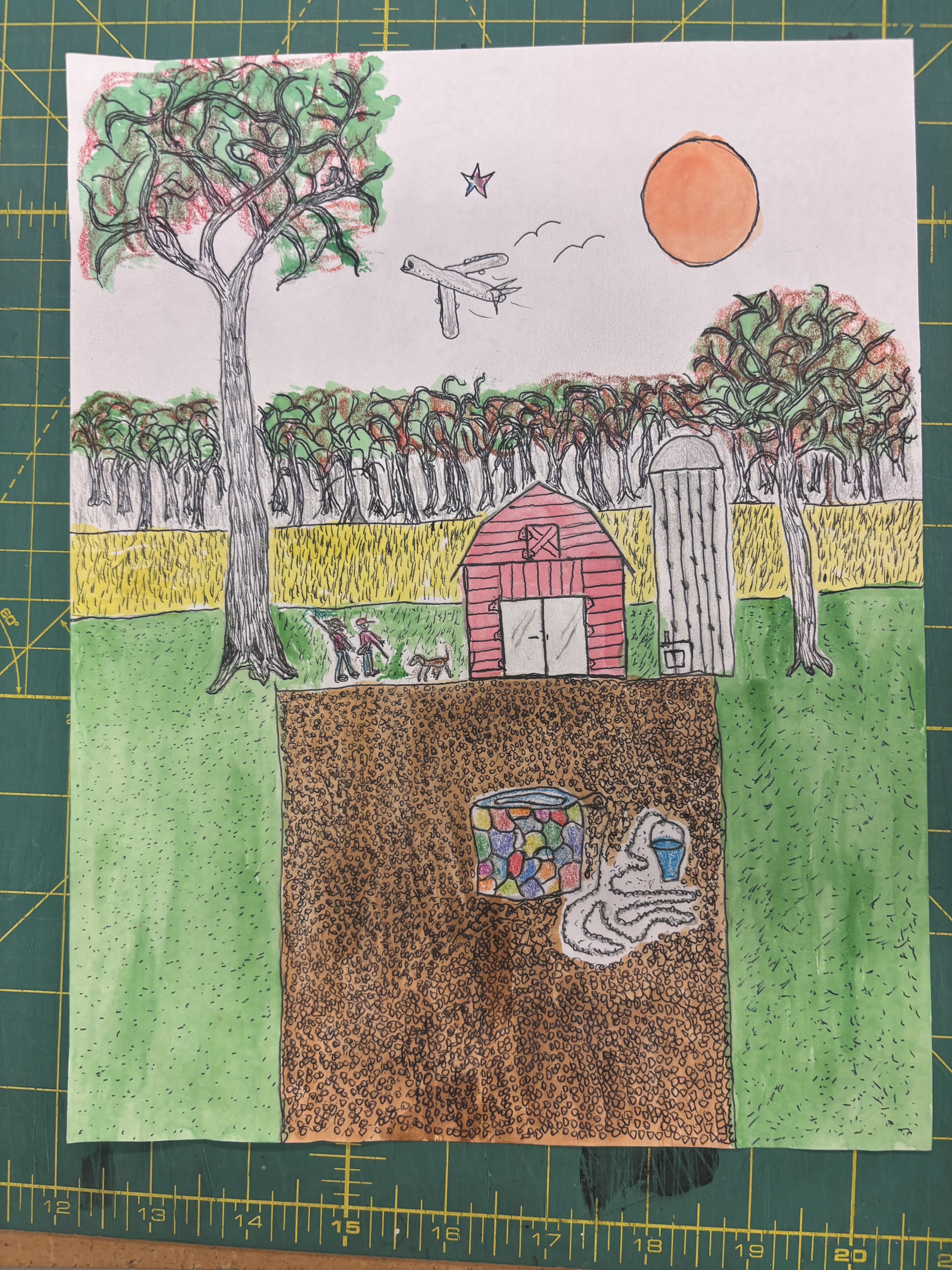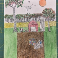 - farm with a rainbow well, two people, a dog, and two trees. there are more trees in the background and a plane, sun and star in the sky