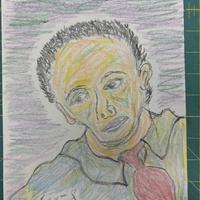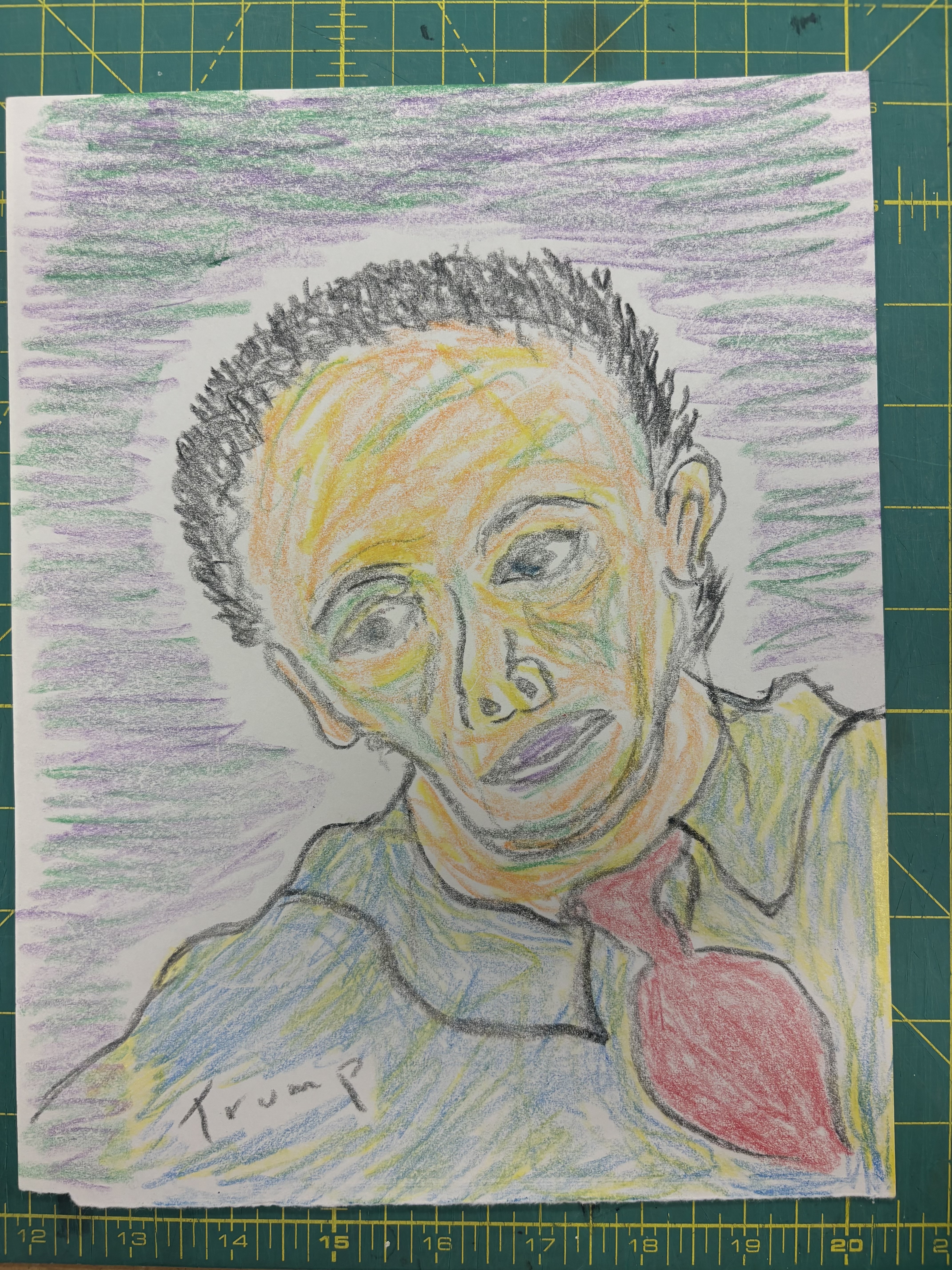 - abstract portrait of a man with dark hair in a blue shirt and red tie