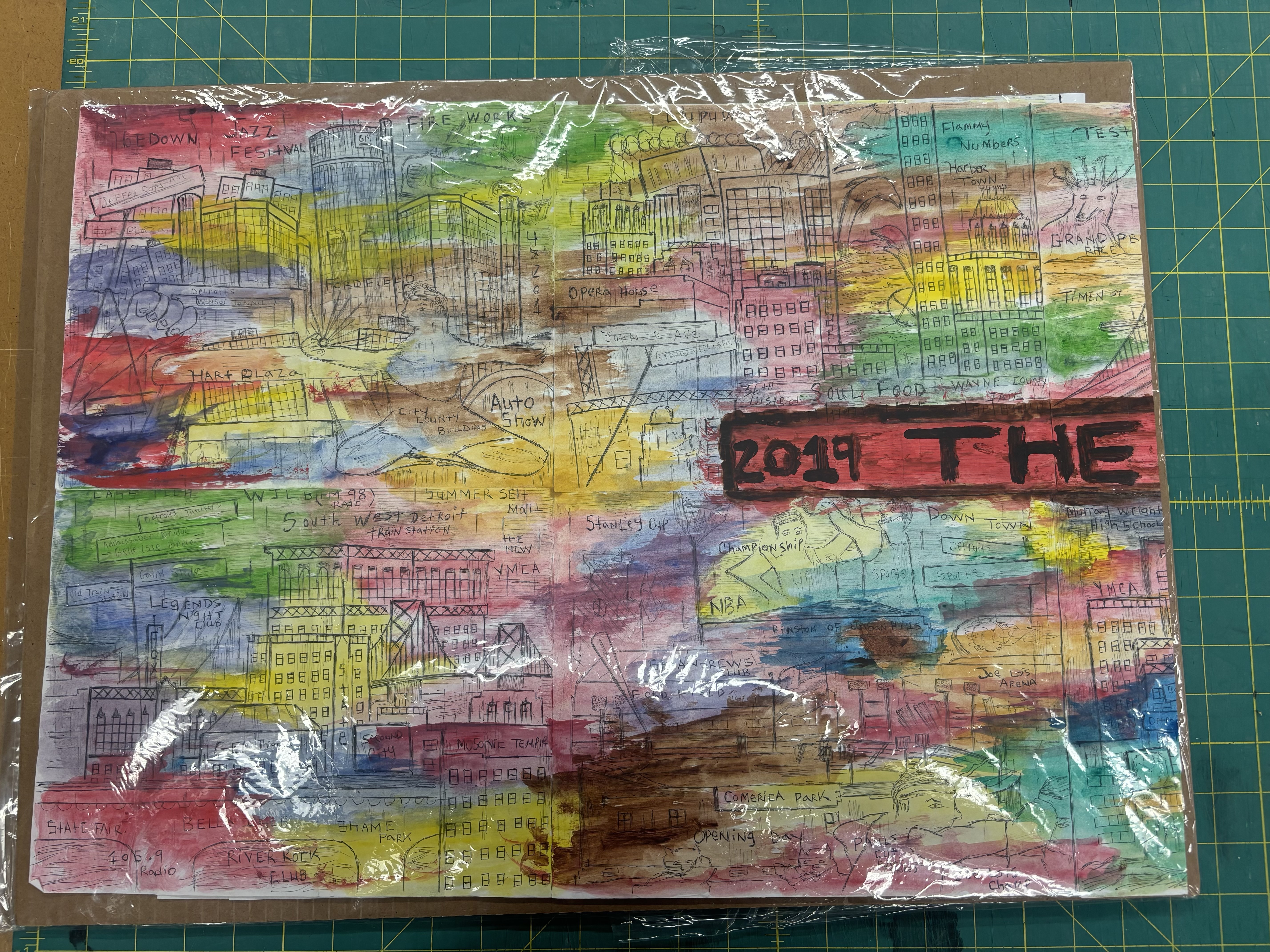 - pen buildings and locations that correlate to detroit along with important detroit moments all brushed in multicolor watercolor. on the right is a red rectangle saying '2019 THE'