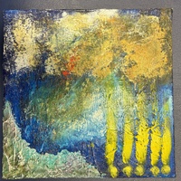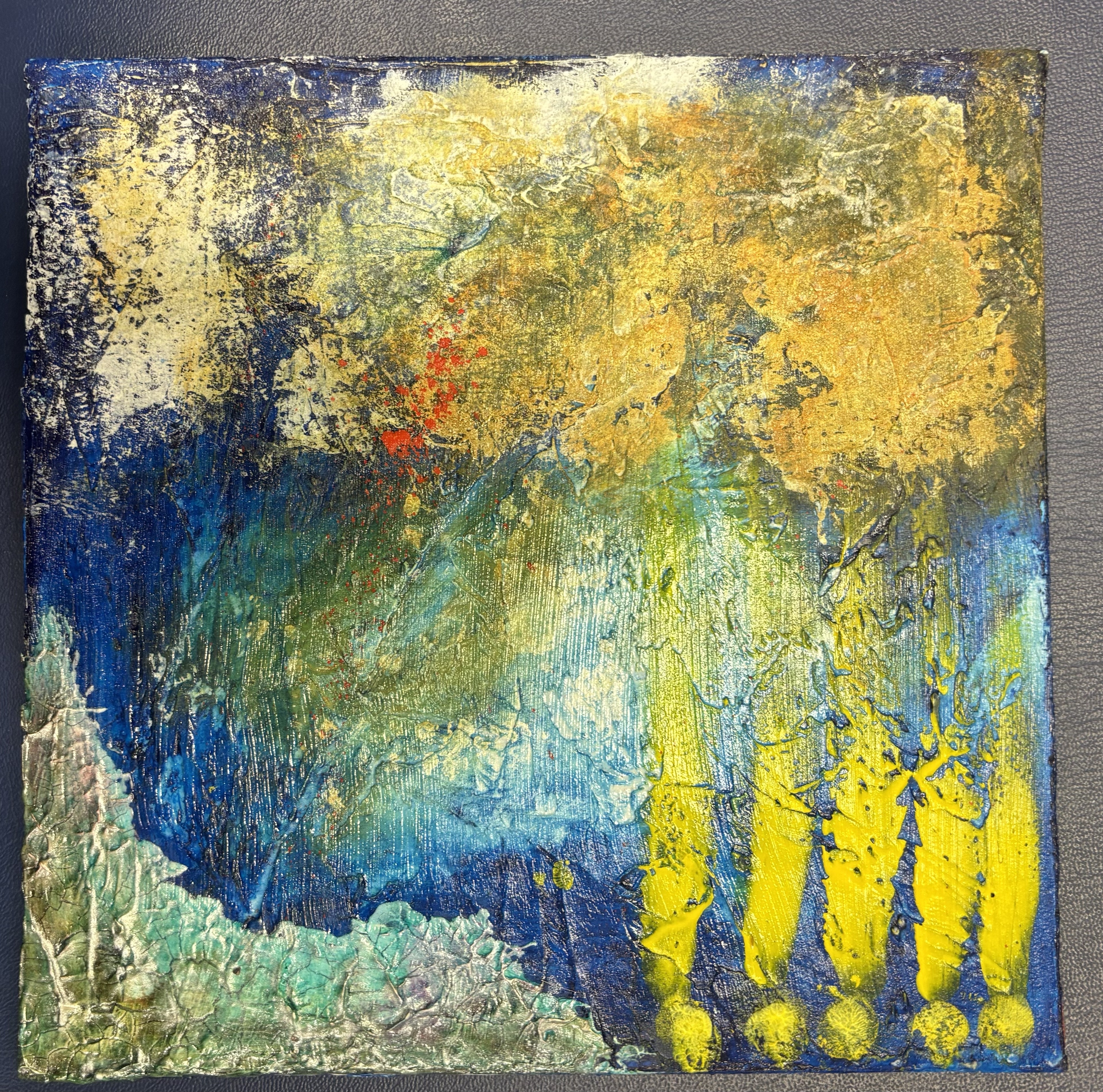 - abstract blue and white painting with 5 yellow verticle stripes in upper left corner and over multicolored splatters and distressings