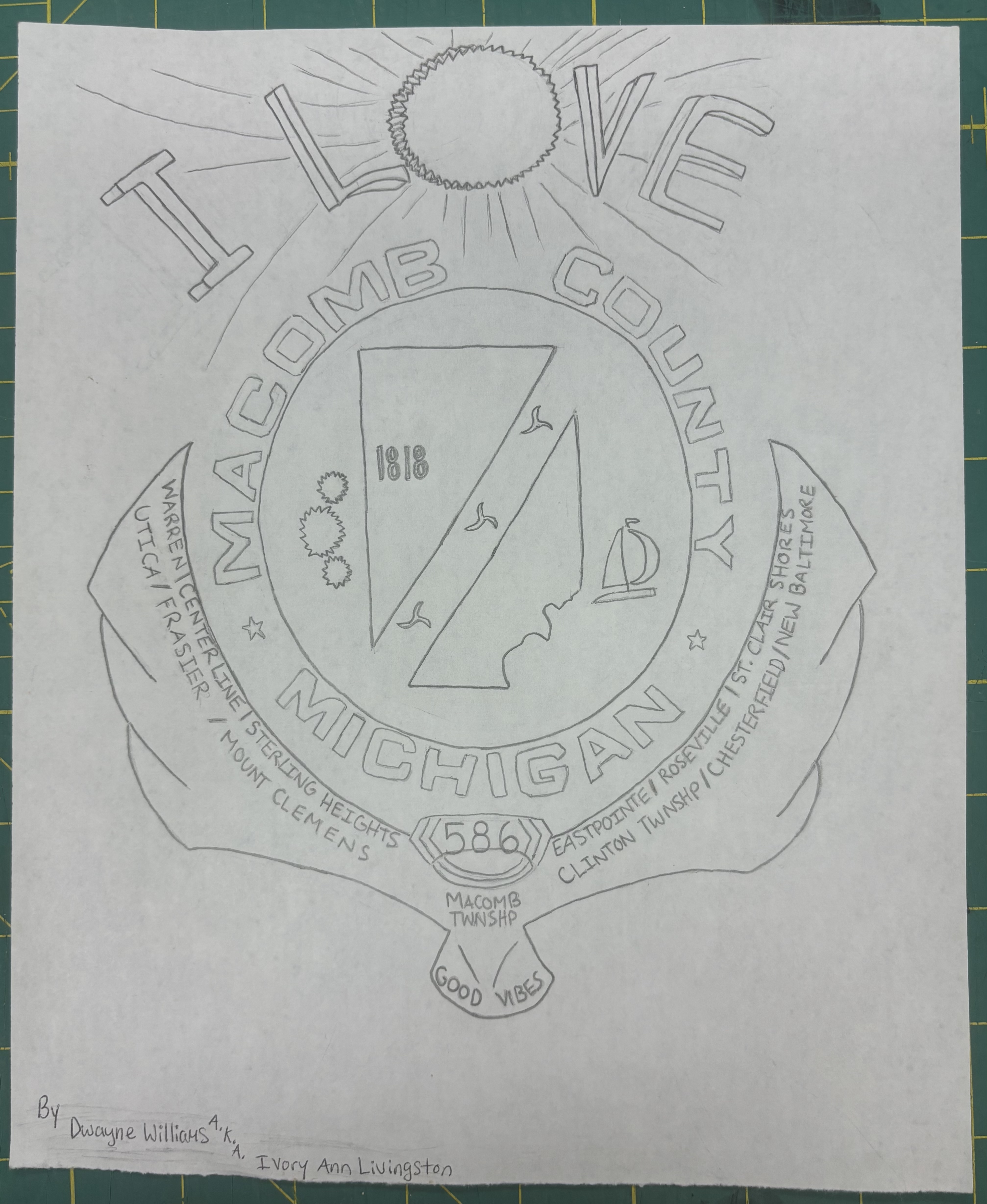 - Macomb county seal ('Macomb County Michigan' around the geographical shape of macomb with a sailboat and 3 gears) with word's 'I LOVE' above.