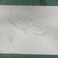 - Airplane flying towards the upper left corner of the page with a man parachuting out in the lower left corner. Above the plane 'Let ALL your troubles be linke this plane & FLY AWAY!'
