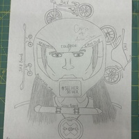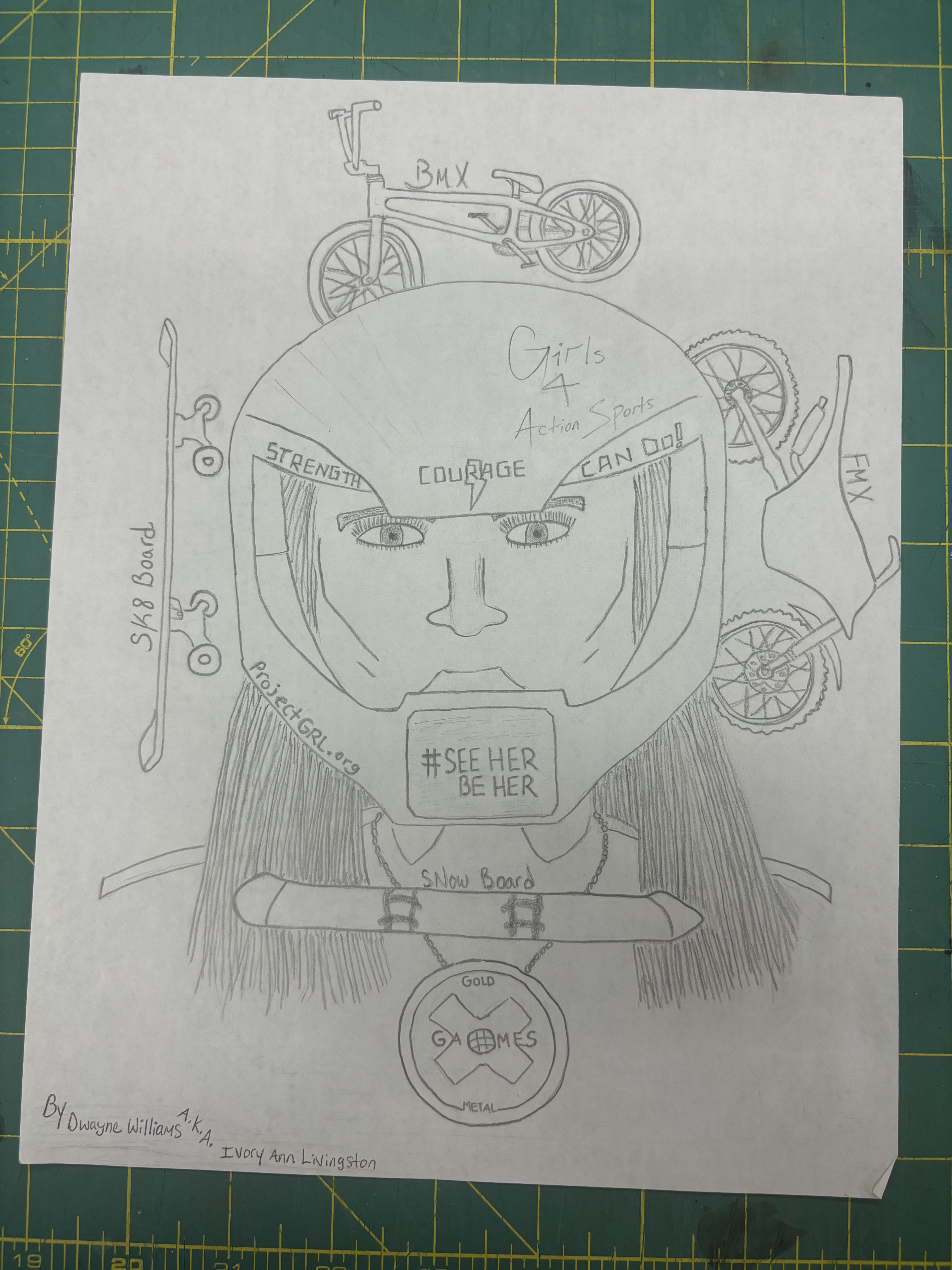 - line drawing of a woman wearing a biker helmet and framed in with a skate board, BMX bike, FMX bike, and snow board. Her helmet has many different phrases and words on it including 'Girls 4 Action Sports' and she is wearing a medal that says 'Gold Games Metal'
