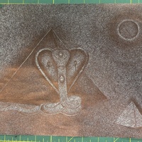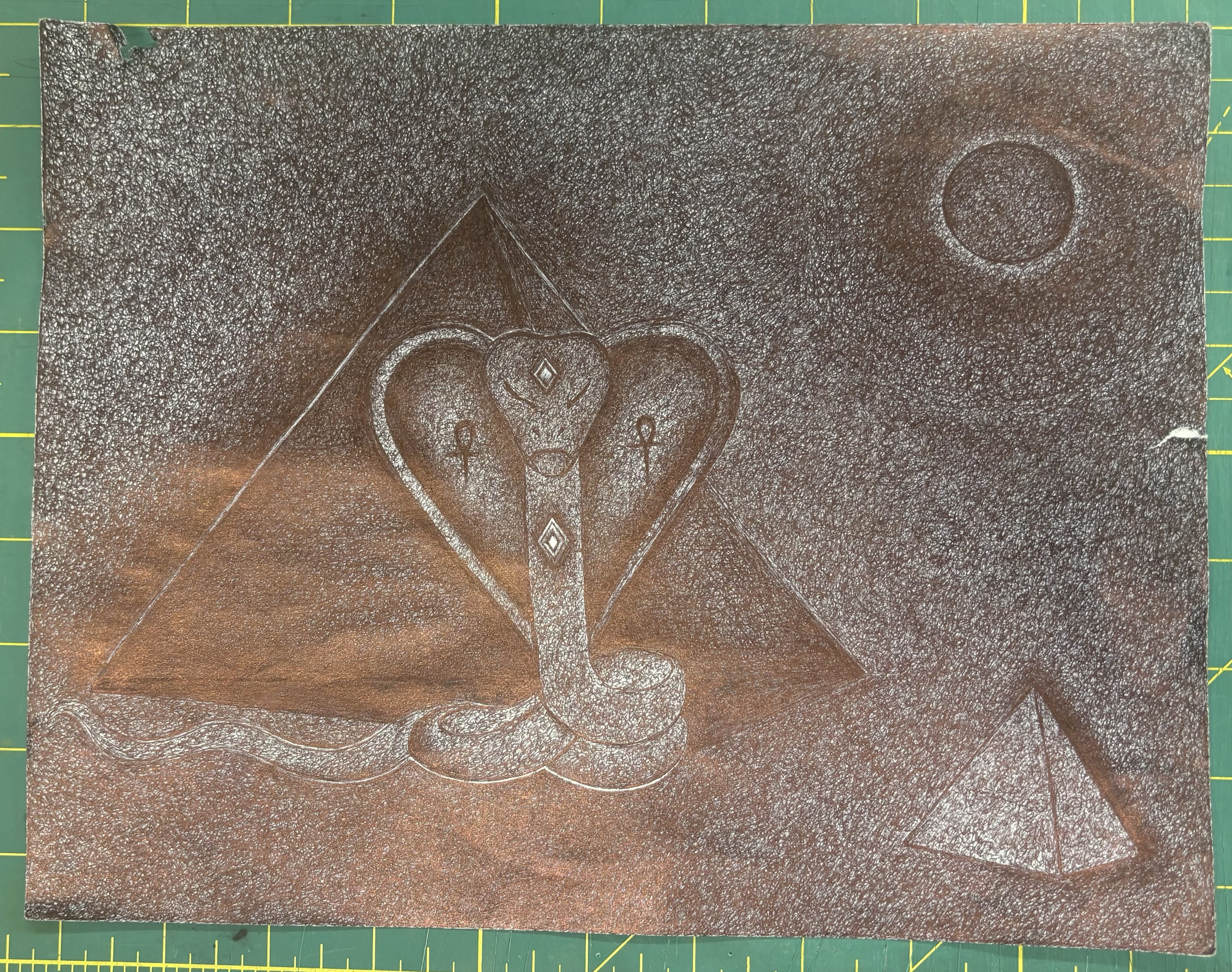 - Egyptian cobra sitting in front of a large pyramid and behind a small one.