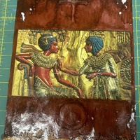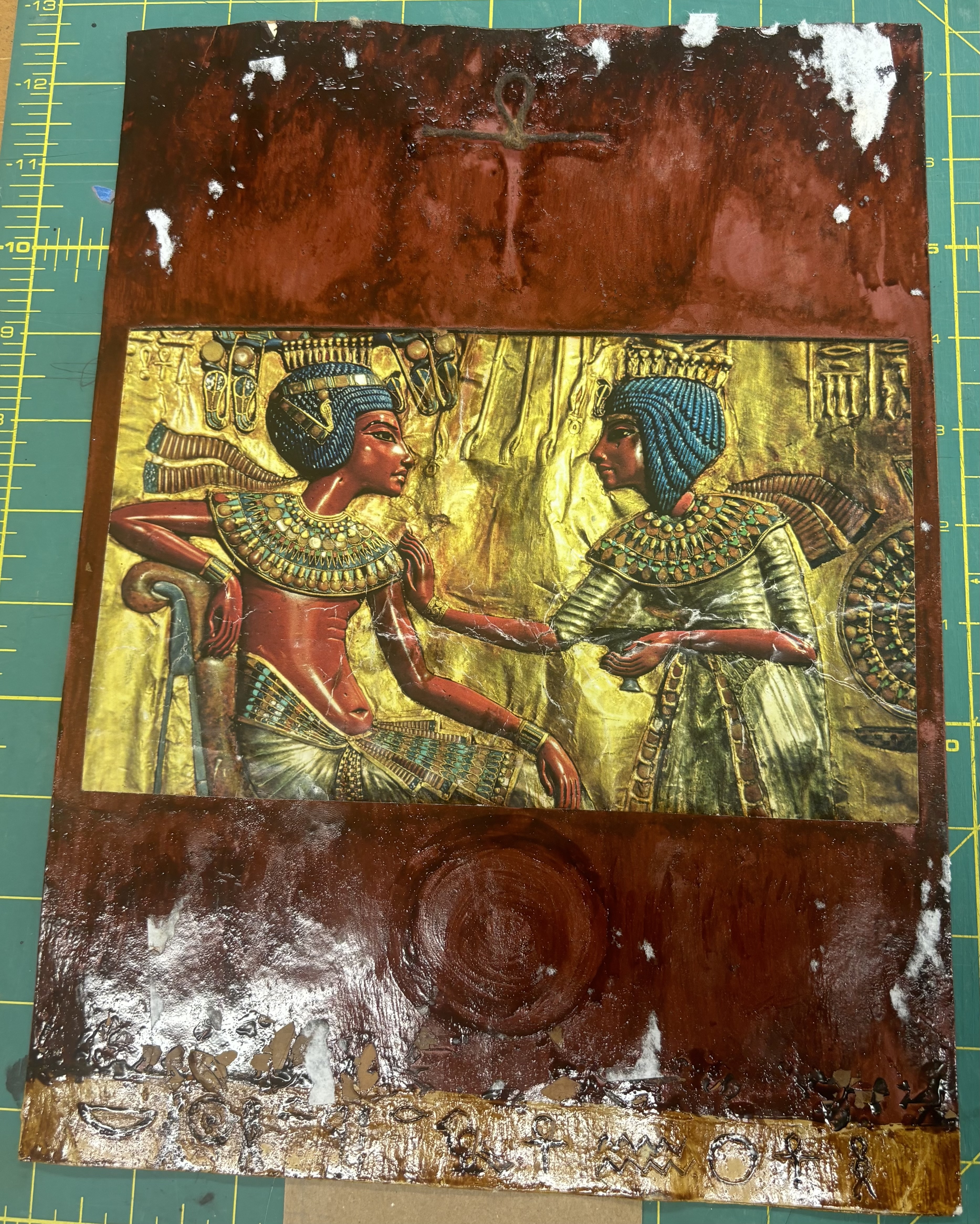 - Image cutout from The Golden Throne of Tutankhamun depicting an ancient egyptian man and woman. The background is a distressed brown with egyptian symbols at the botom in a line