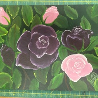 - 3 pink roses and 3 purple roses at varying stages of bloom surrounded by leaves