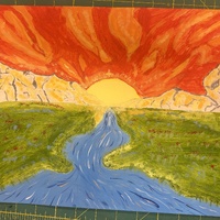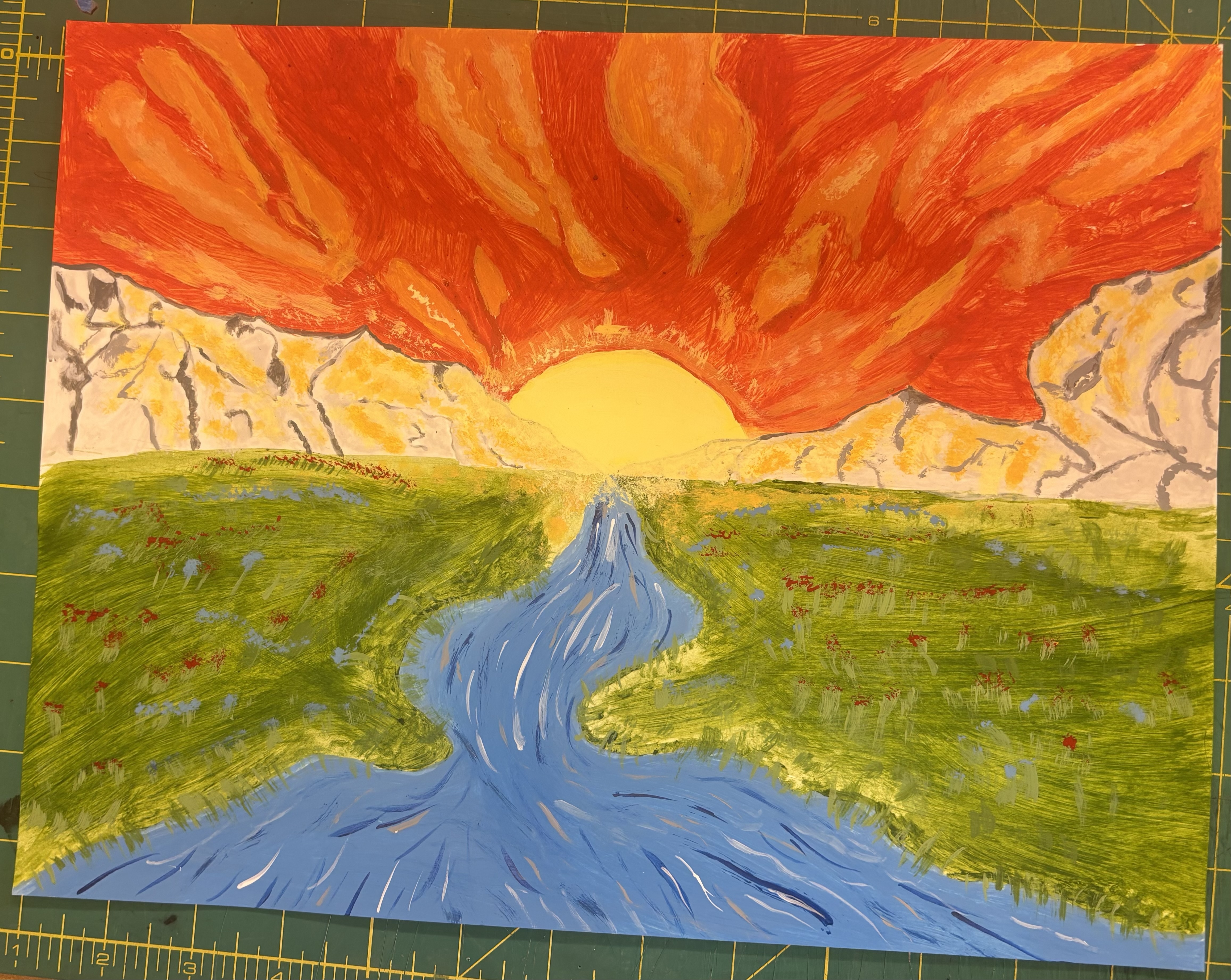 - landscape with a stream running down the middle of a feild, between mountains, and towards a sunrise.