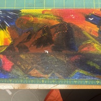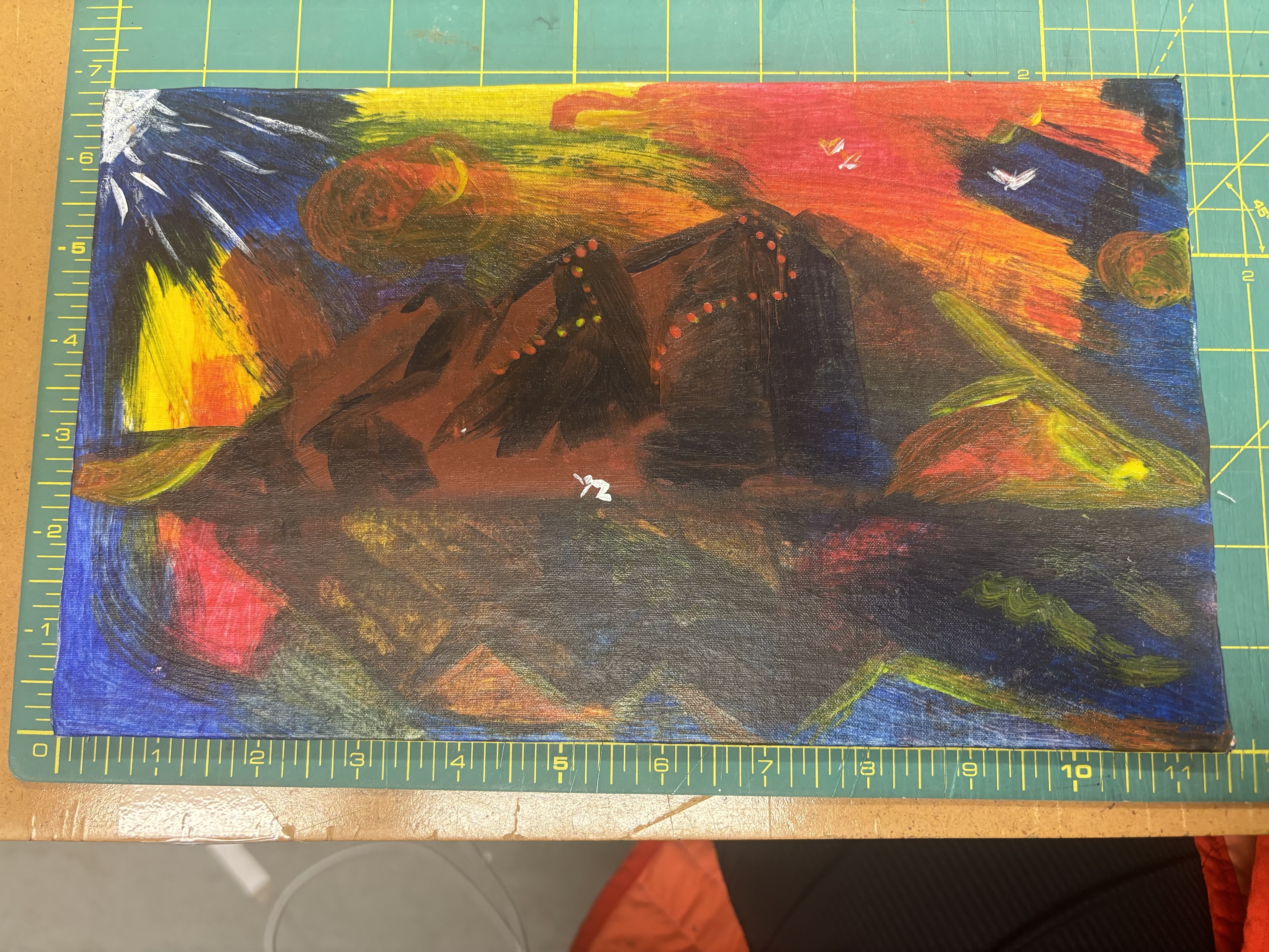 - abstract landscape of mountains with a small white stick man bowing and reaching towards the sun