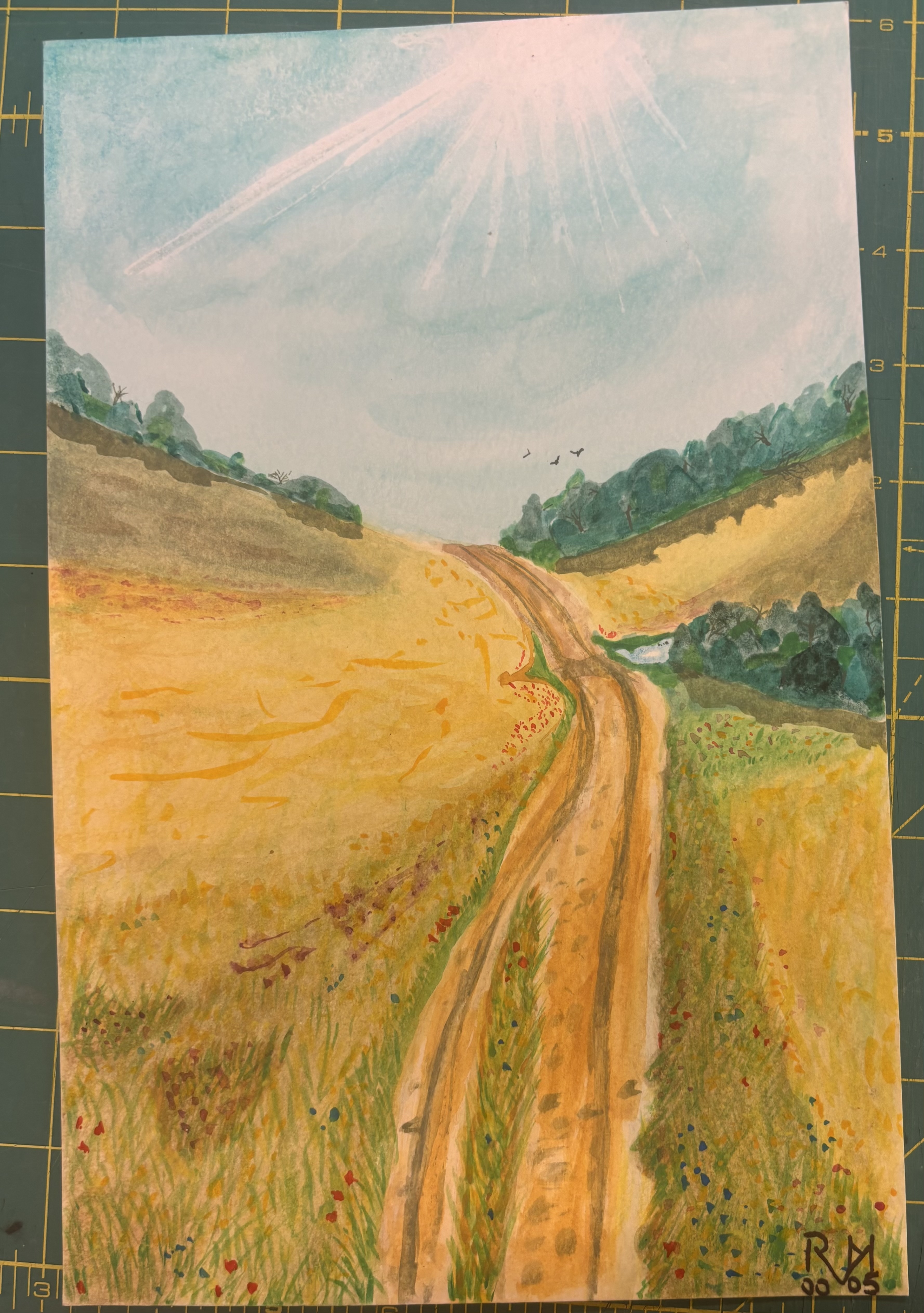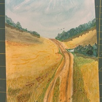 - Path going down a green and yellow field with abstract trees in the distance and a blue sky