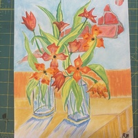 - two vases with orange flowers on a table in front of a blue wall with brick peaking through