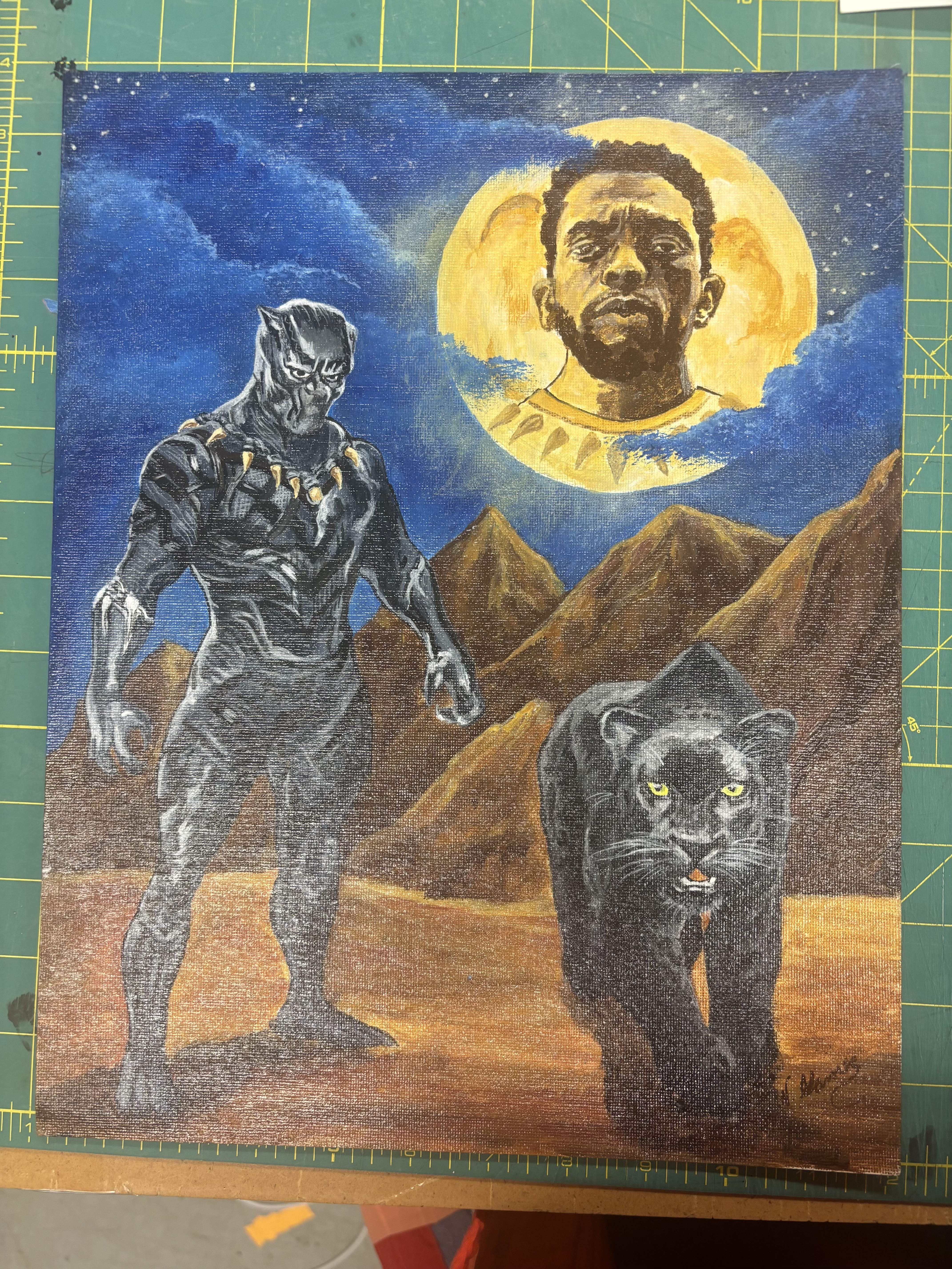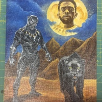 - Black Panther (superhero) standing next to a black panther (animal) in fornt of mountains. Above is a moon with Chadwick Boseman's face in it.