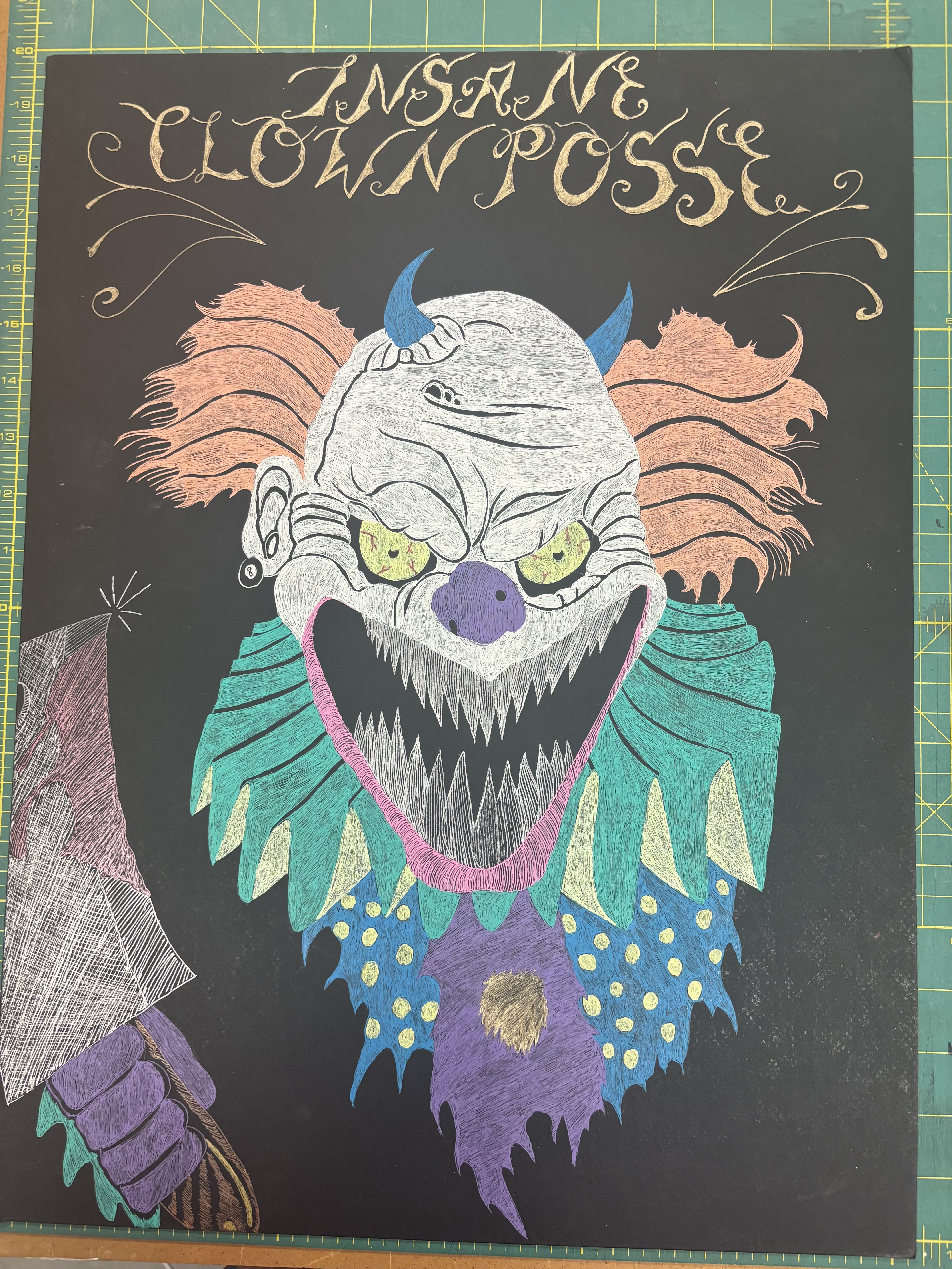 - Clown with orange hair smiling with sharp teeth and holding a cleaver with blood on it. Above 'Insane Clown Posse'