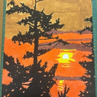 - sillouette of trees in front of a body of water orange from the sunset with a dark orange sky