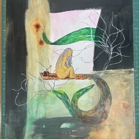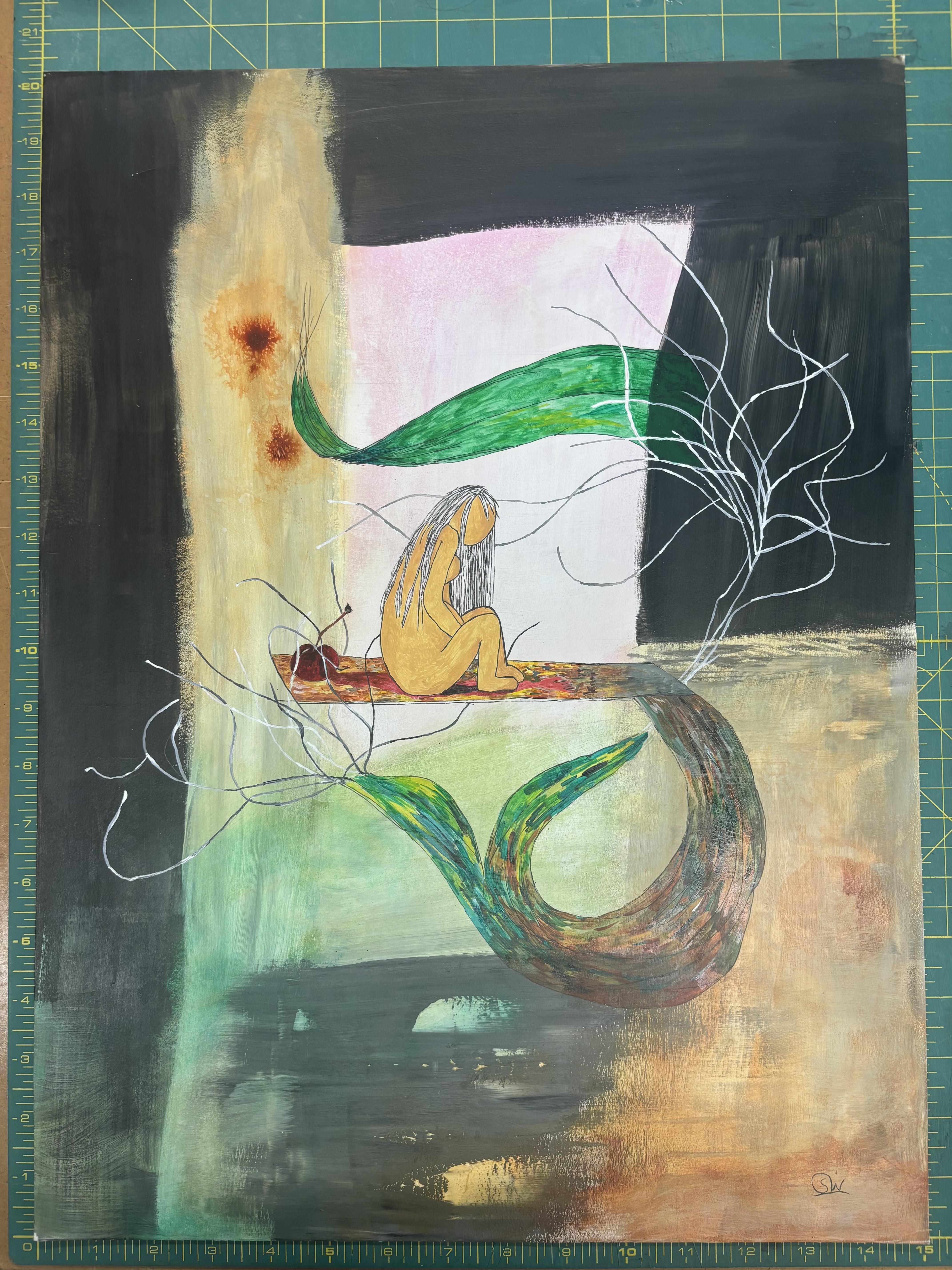 - Abstract woman sitting next to a cherry on a platform that curls into vine like lines. The background is mae up of large lines of black, light pink, orange, grey, and green.