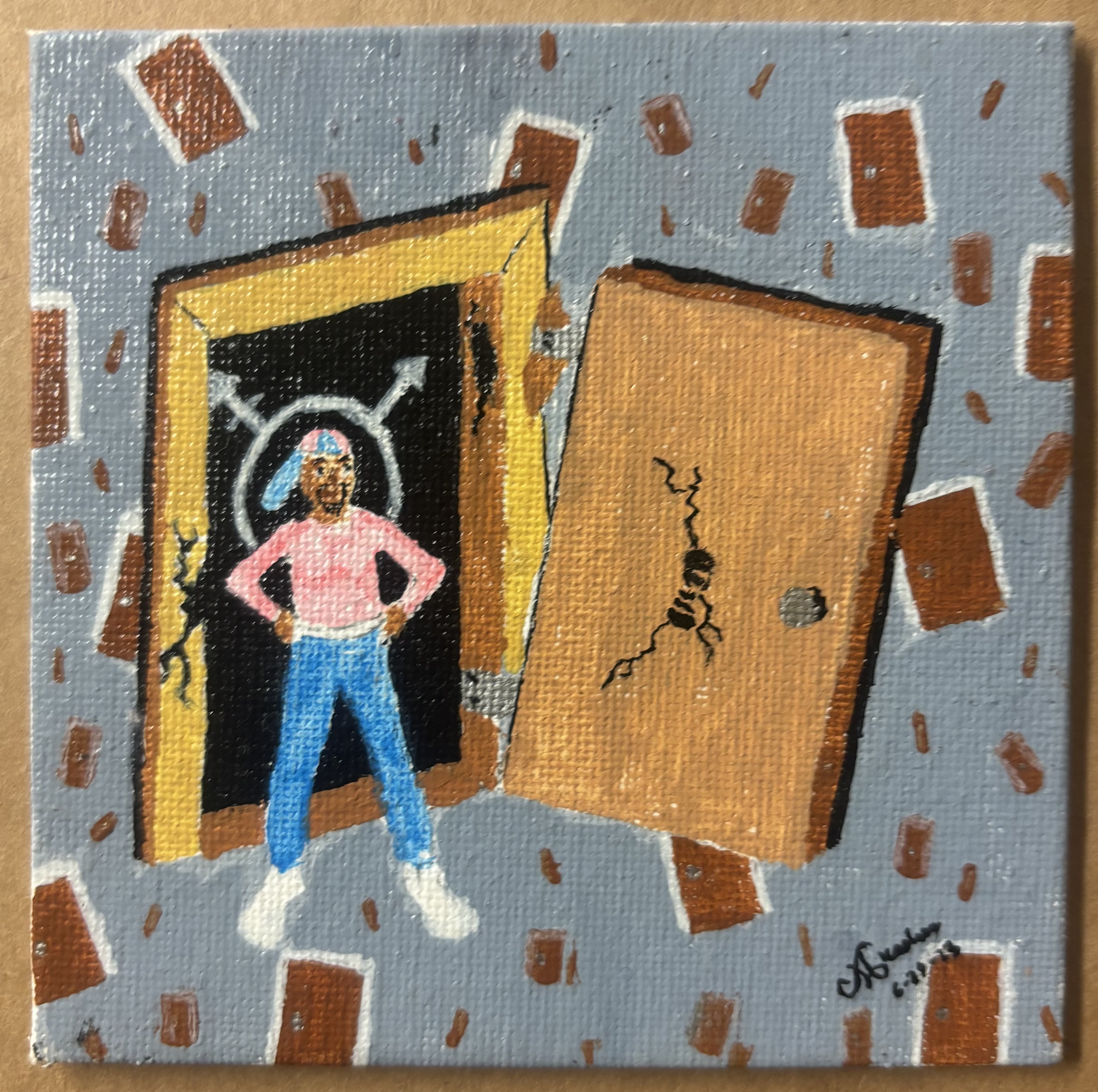 - A person coming out of a cracking closet wearing blue, pink, and white in front of a trans symbol. Behind are many floating closet doors.