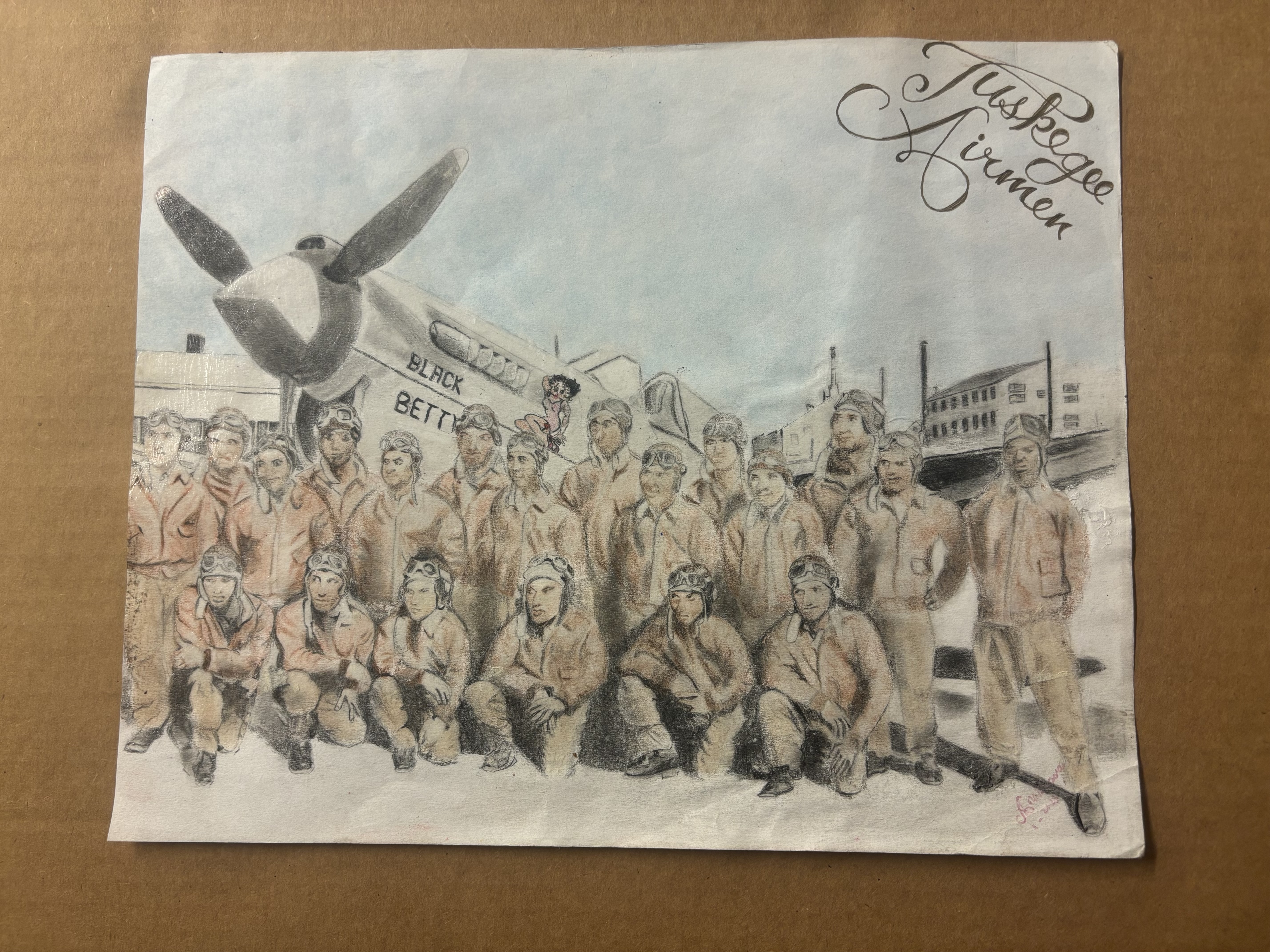 - Twenty men in pilot uniforms sitting and standing in front of 'BLACK BETTY' a plane with betty boop on the side.