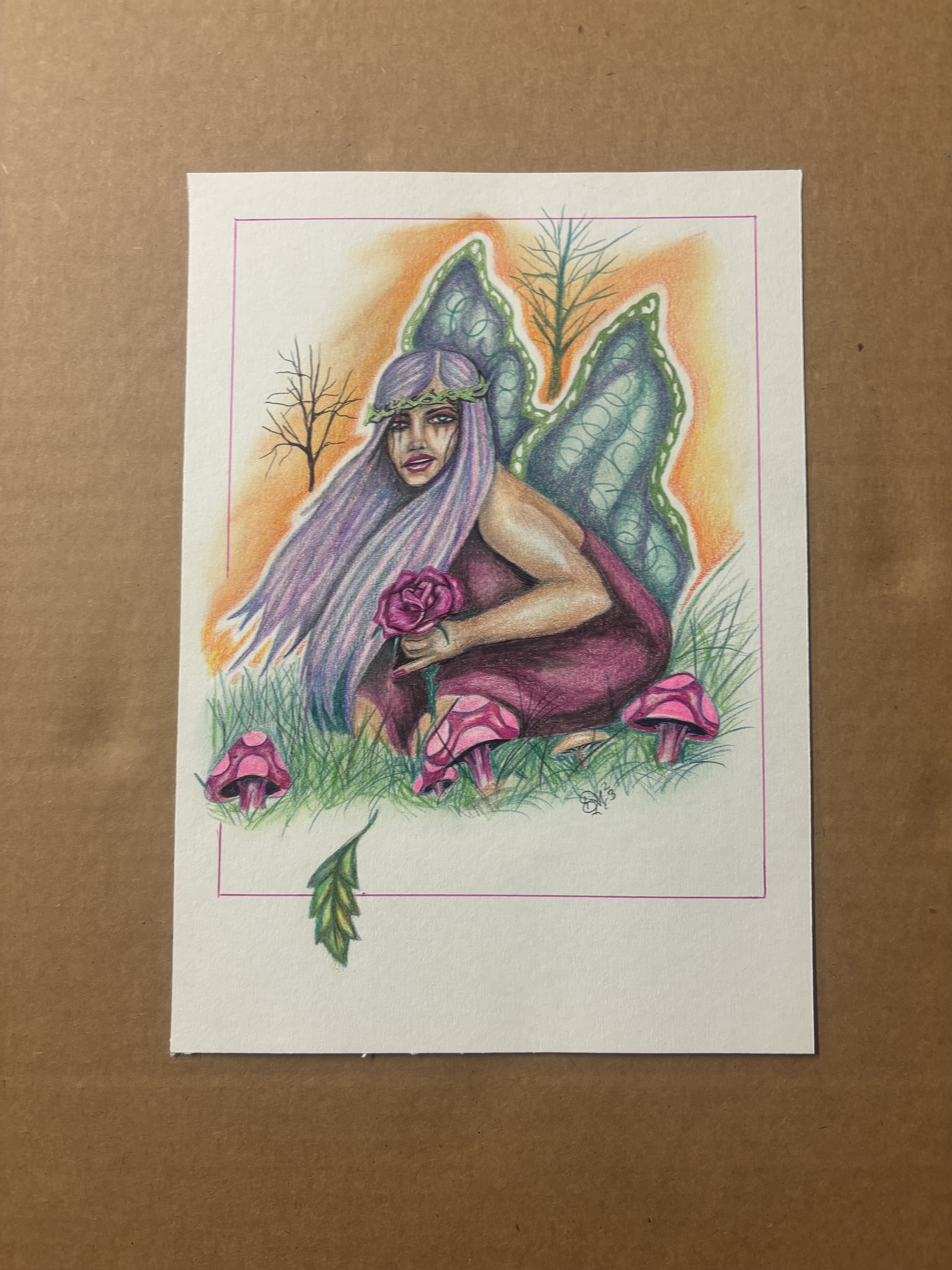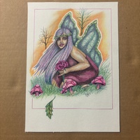 - Fairy with green wings, pink hair, and a pink dress crouching in a feild of grass and pink mushrooms.