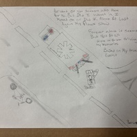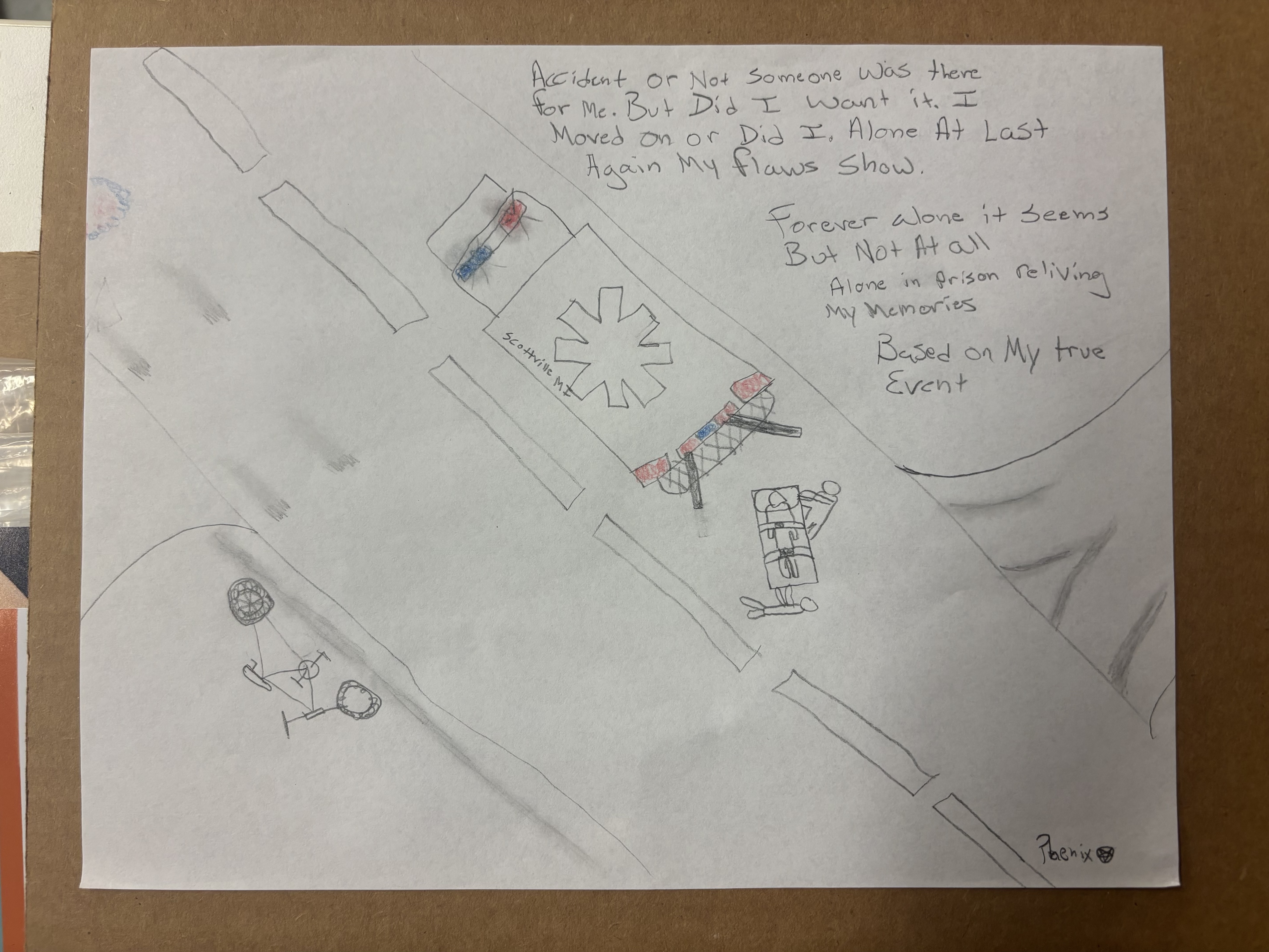 - Bird's eye view of a man on a stretcher getting wheeled into the back of an ambulence and a bike laying on the other side of the road with a poem in the top right corner.