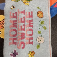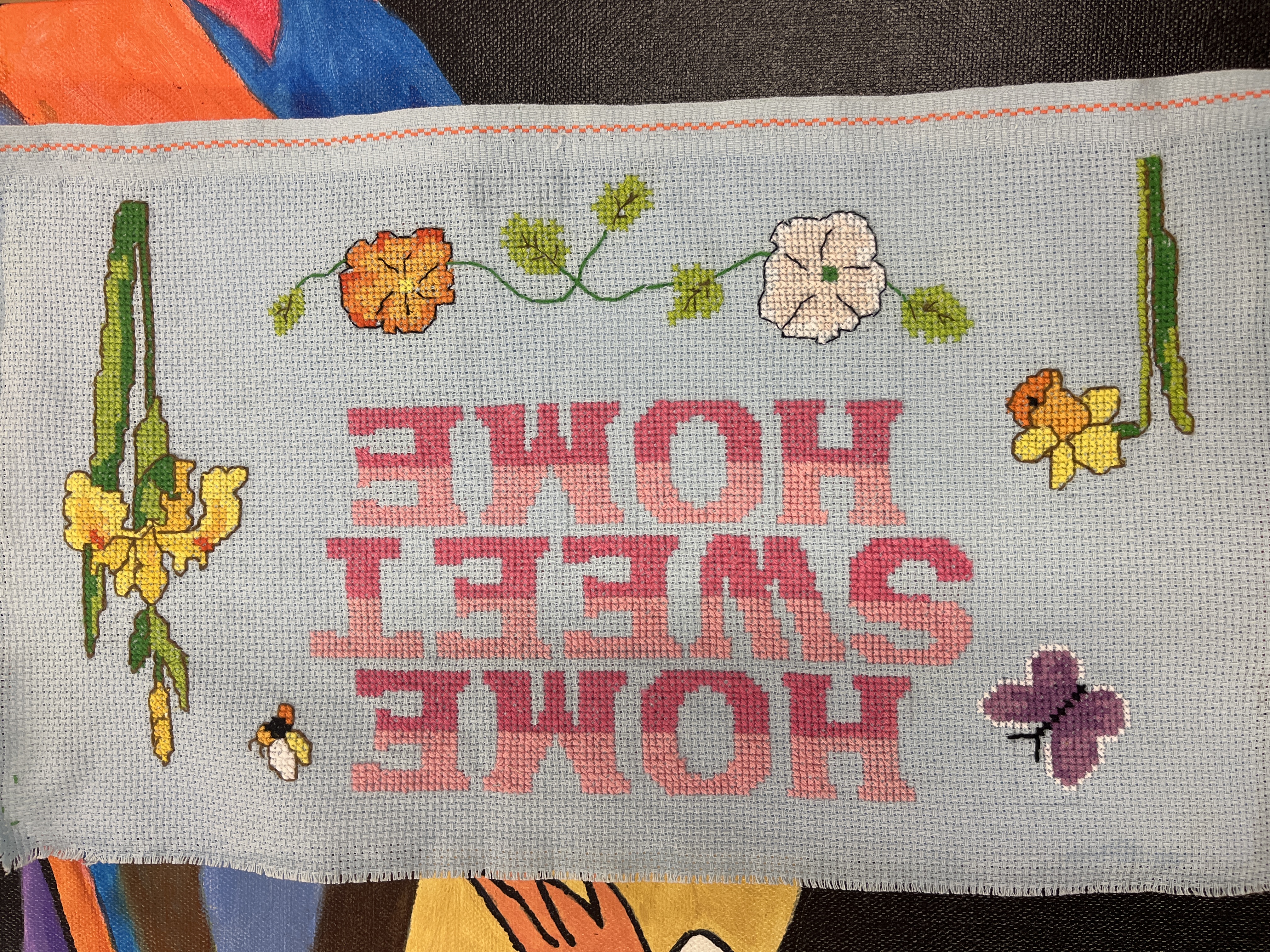 - cross stitch hanging sign saying 'home sweet home' surrounded by flowers and insects, Detroit Public Theater 2024
