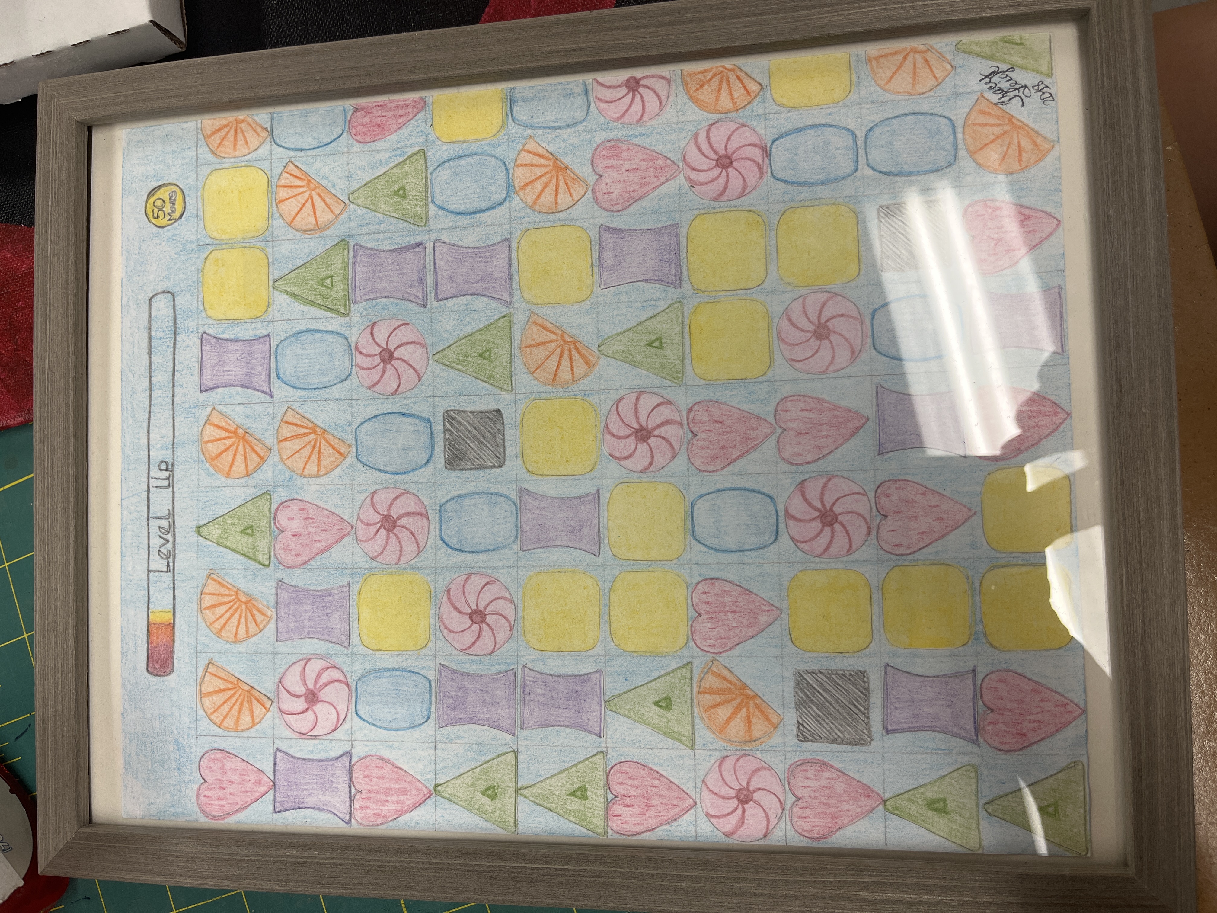 - a game of Candy Crushpink, yellow, blue, green icons on a screen with the words 'Level Up' at the top, Detroit Public Theater 2024
