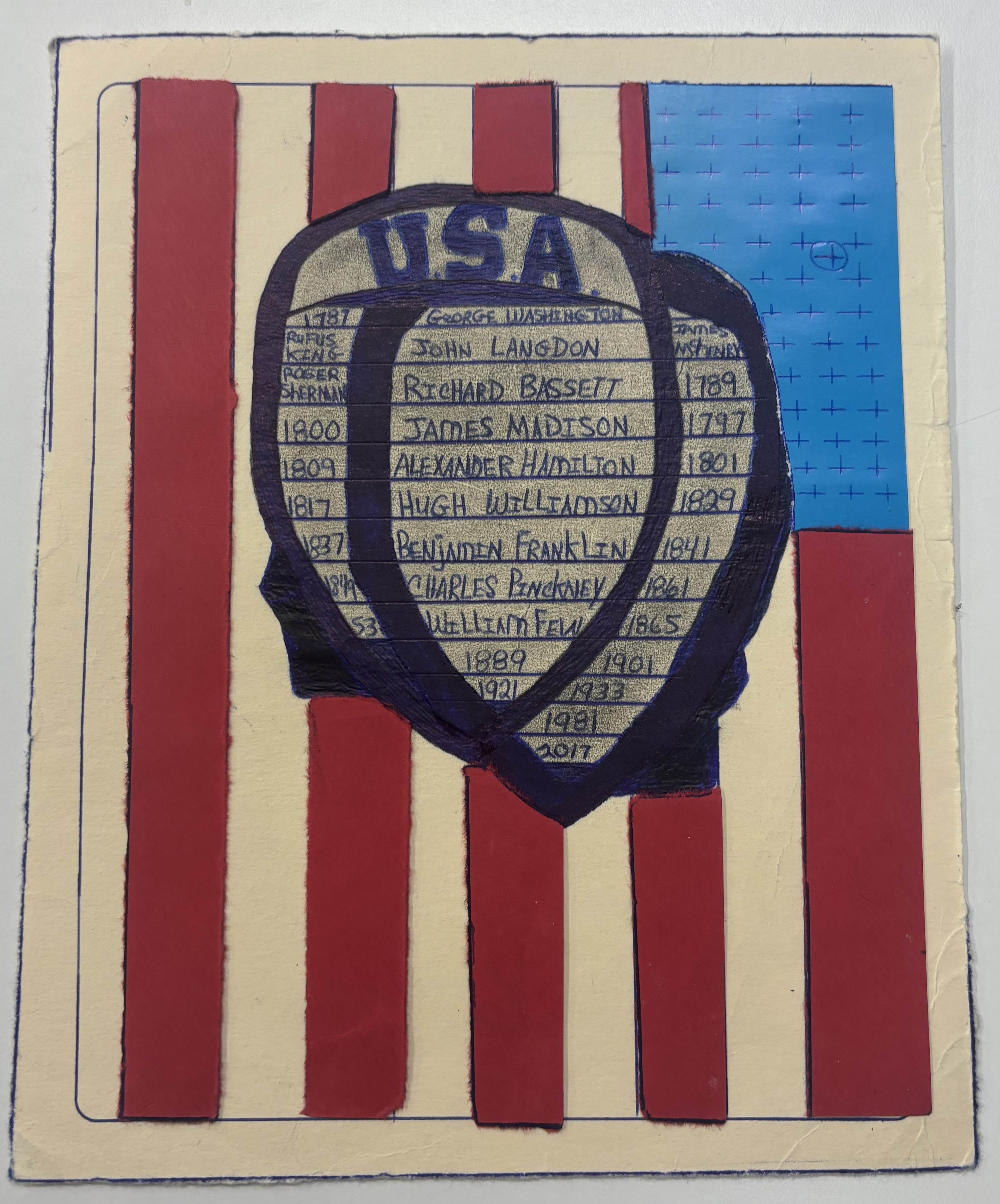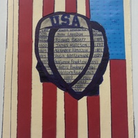 - US Flag with a 'USA' badge in front of it with many names and dates listed on it