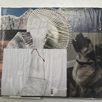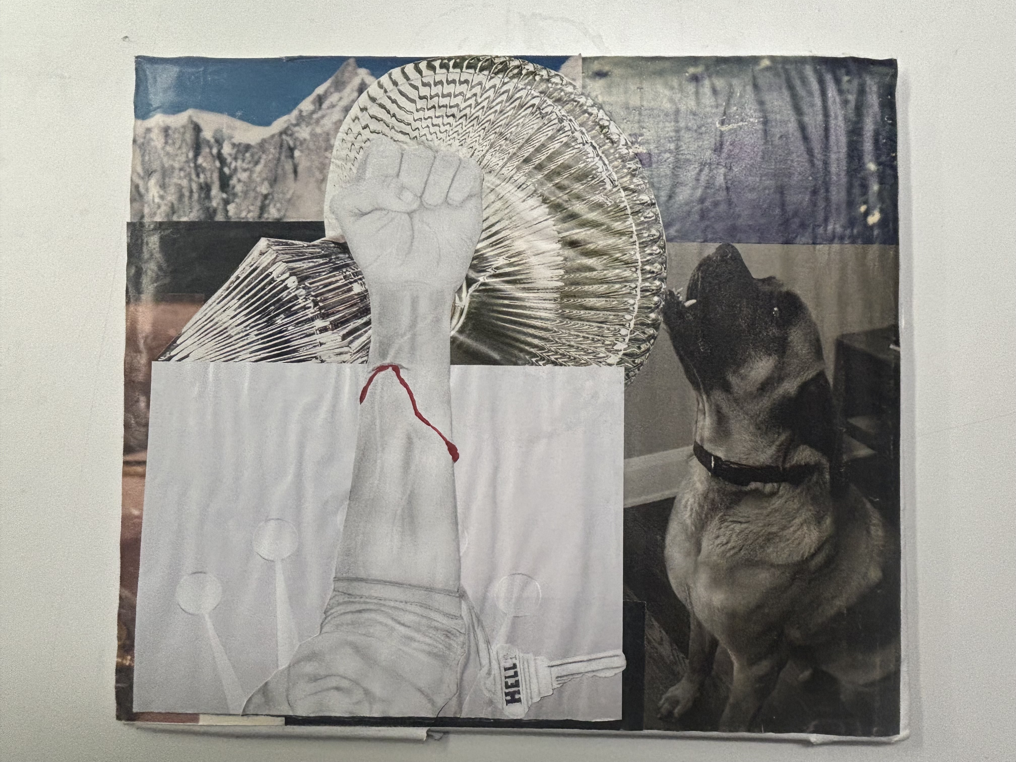 - collage of a fist with a bloody cut on the arm in front of a glass object and a black and white dog