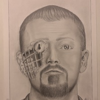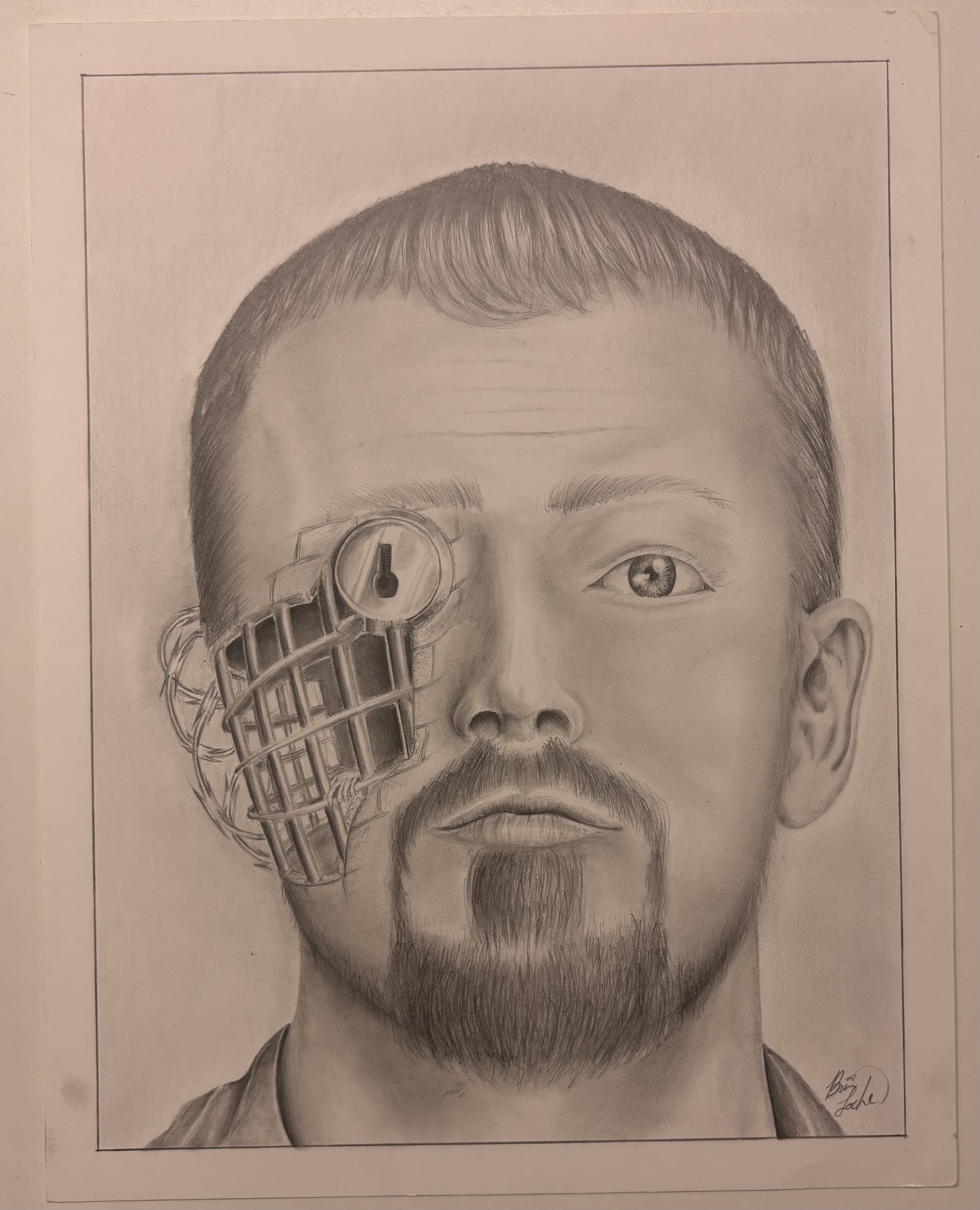 - Self portrait of a man with short straight hair and a goatee beard who has a lock and cage taking on the left side of his face