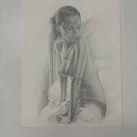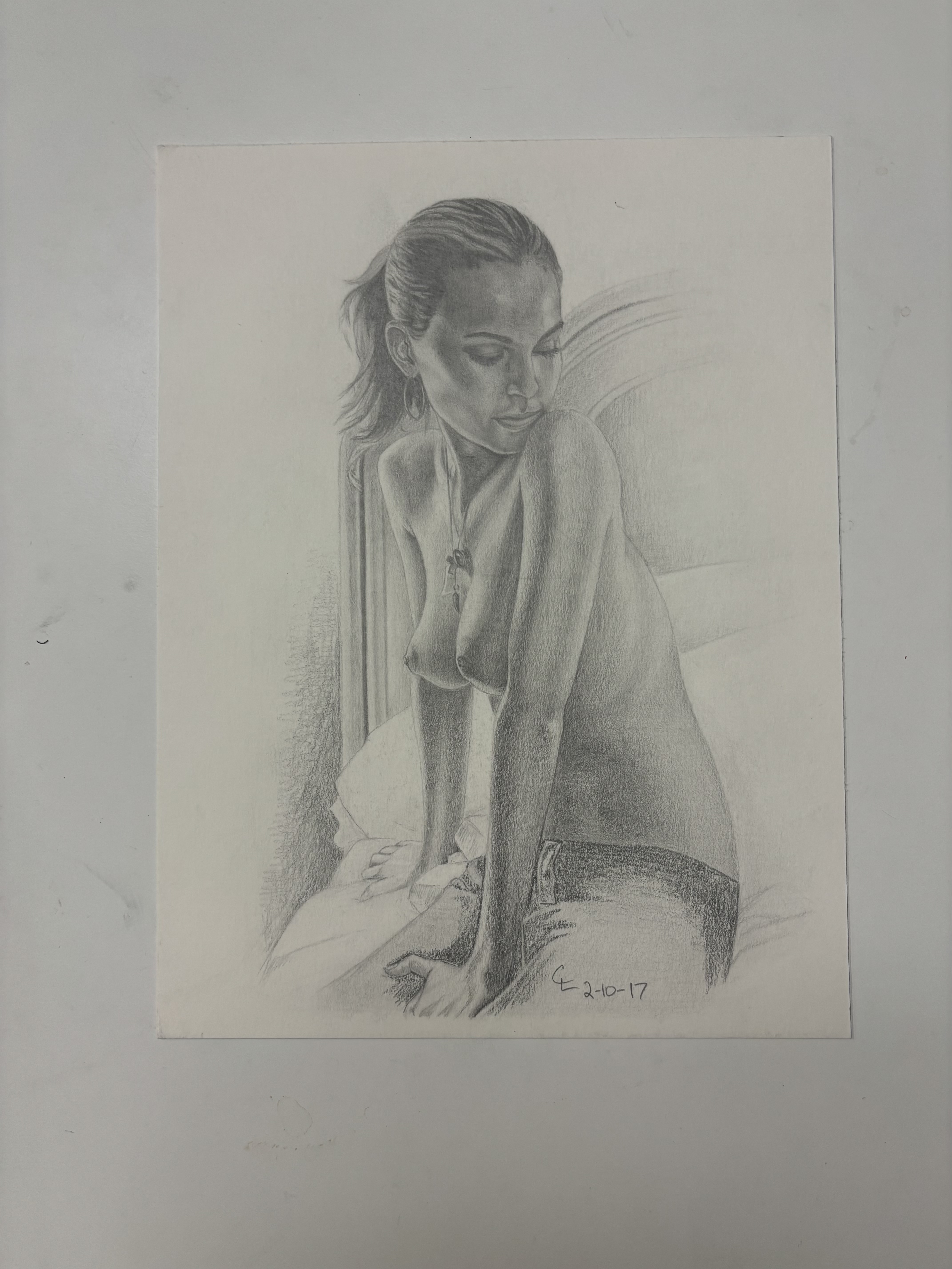 - Woman with hair in a ponytail sitting on a bed shirtless