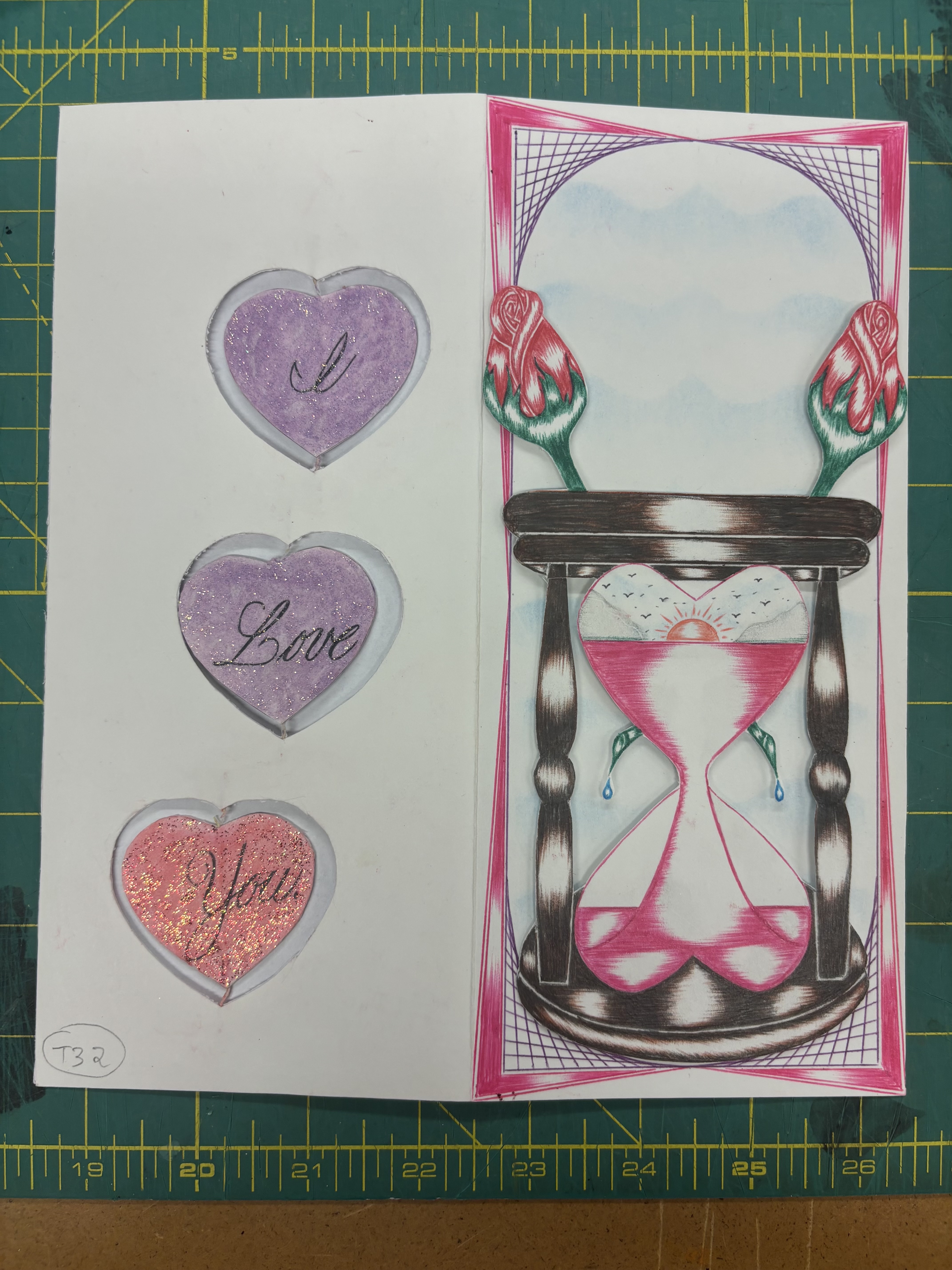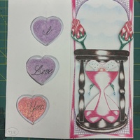 - card face - hourglass with pink sand and two roses at the top, back - three hearts vertically stacked saying 'I Love You'