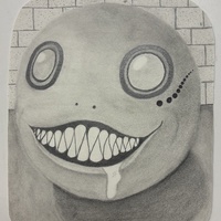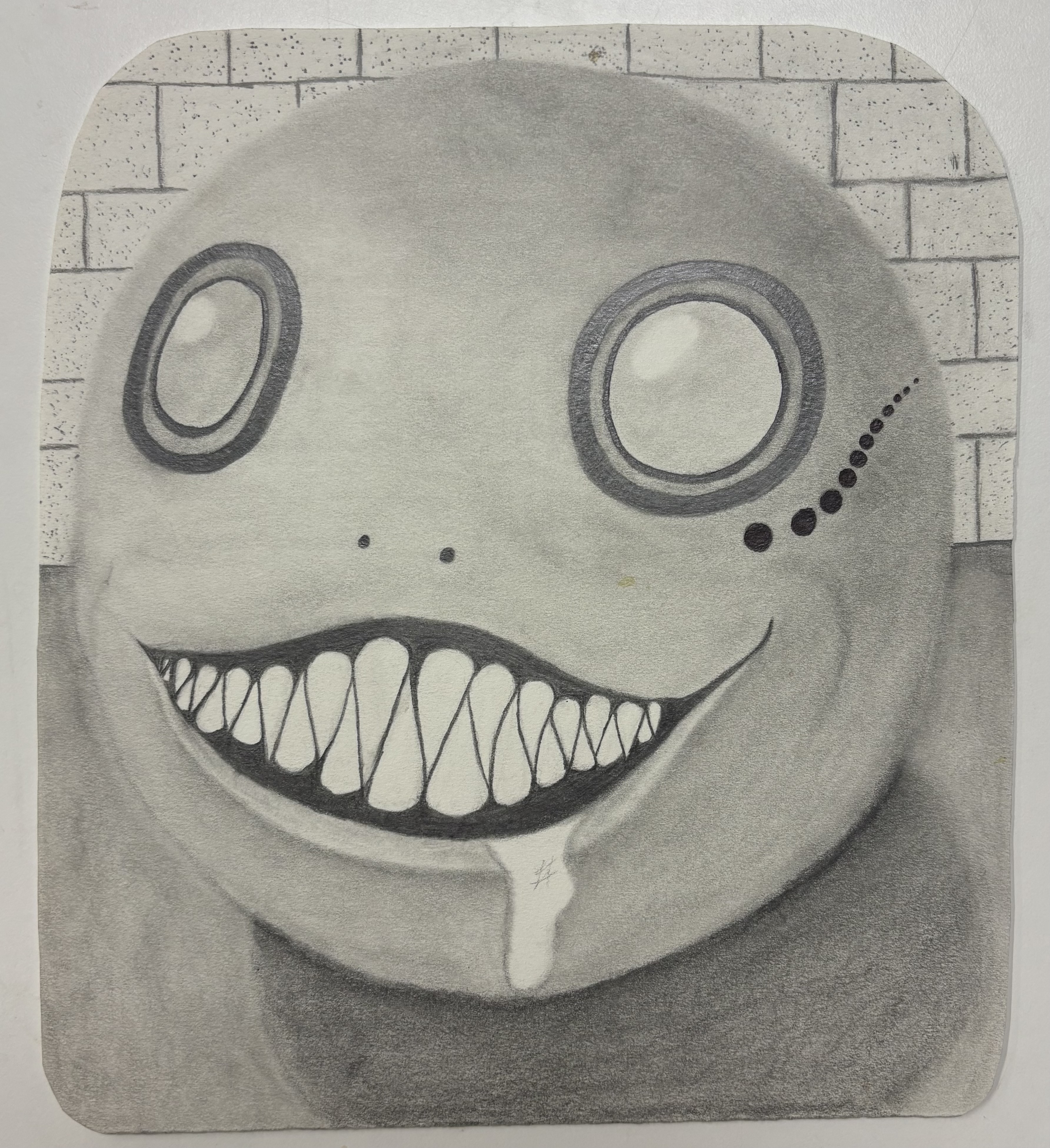 - round face with large circular eyes and a sharp toothed smile in front of bricks