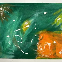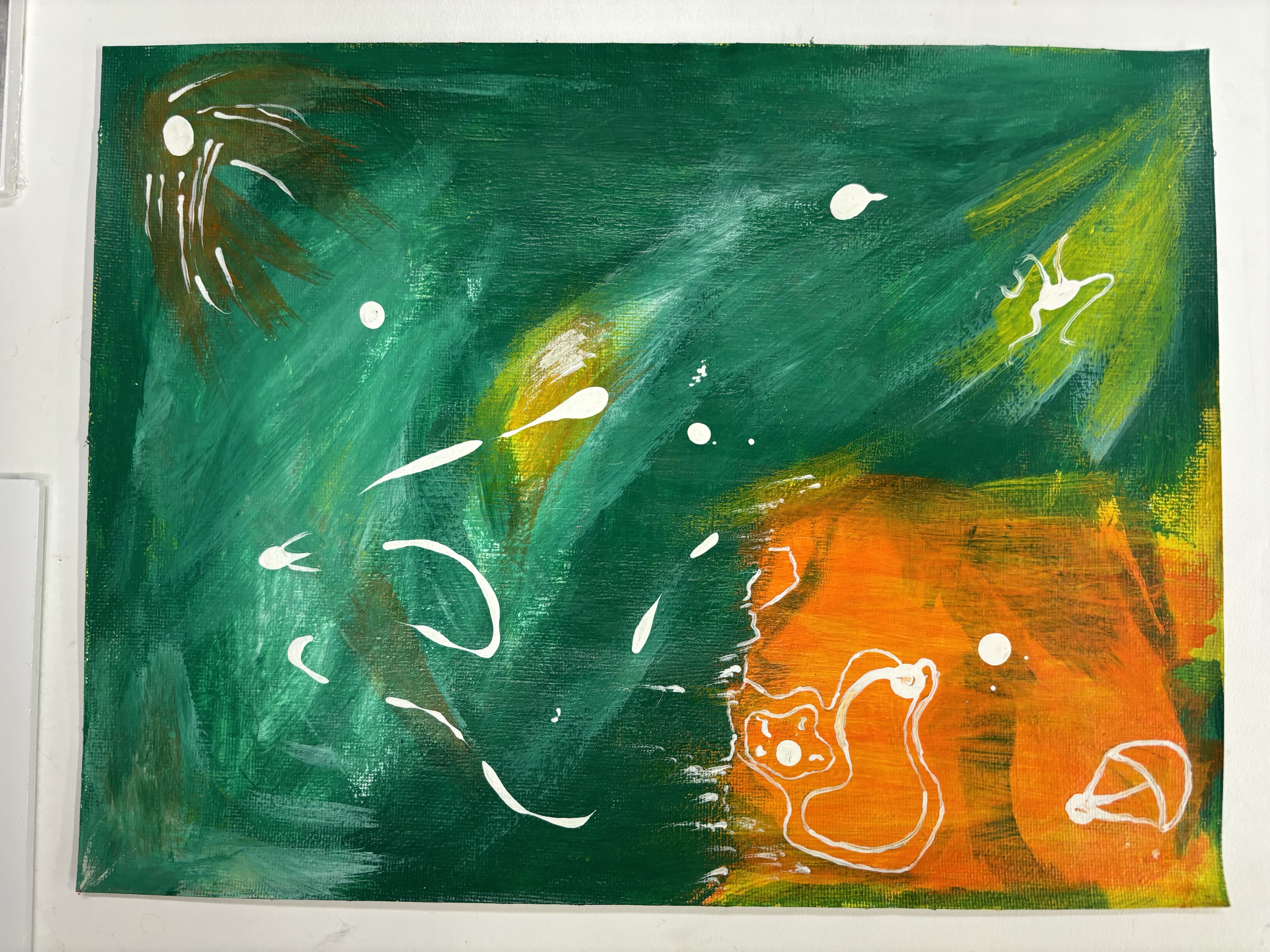- green background with white abstract chapes and an orange square in the bottom right corner