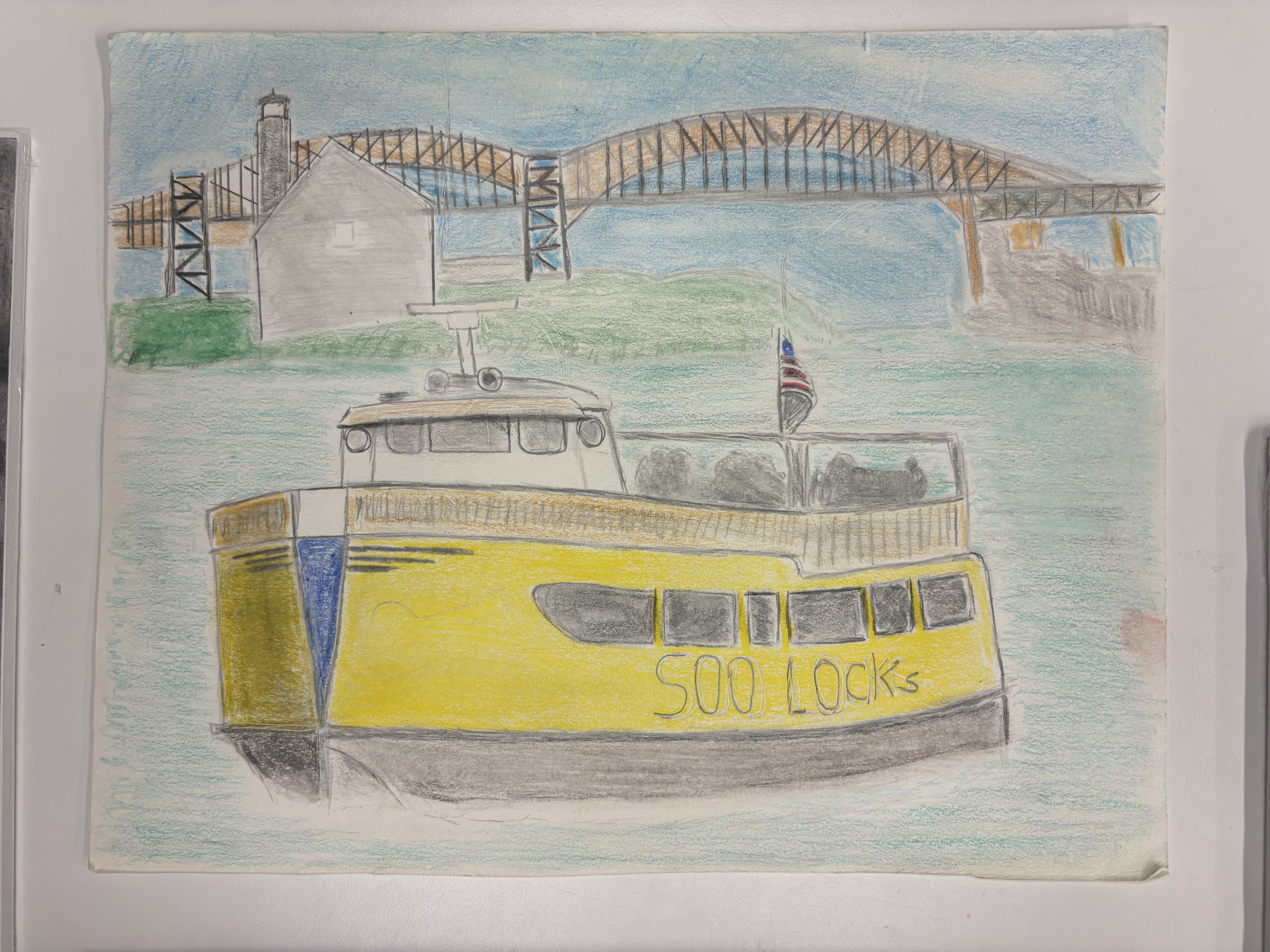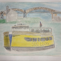- yellow boat 'S00 Locks' on the water in front of a bridge