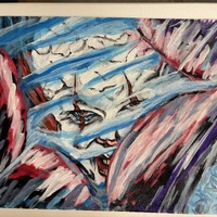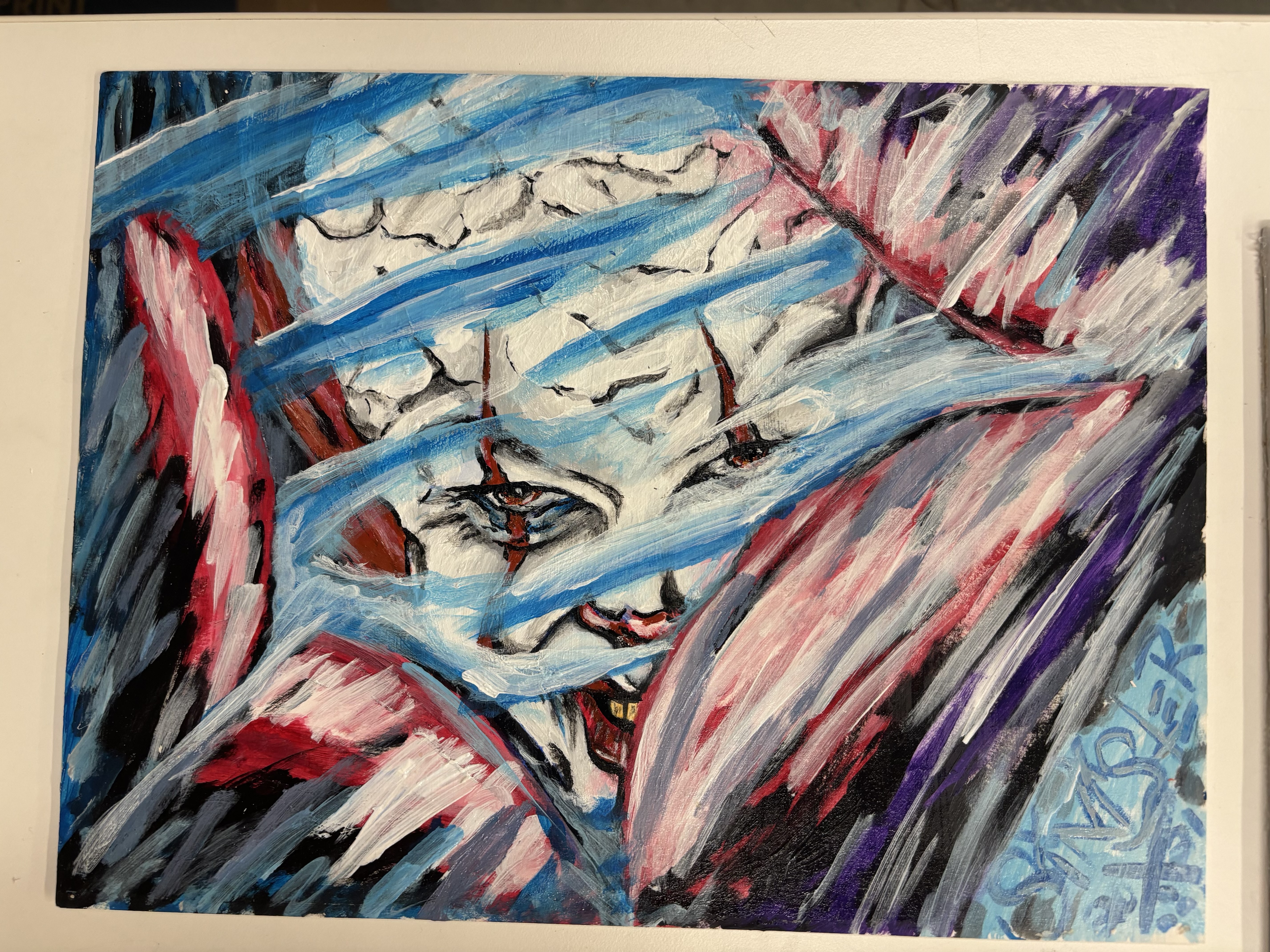 - pennywise peeking through brushes of blue, white, red, and purple paint