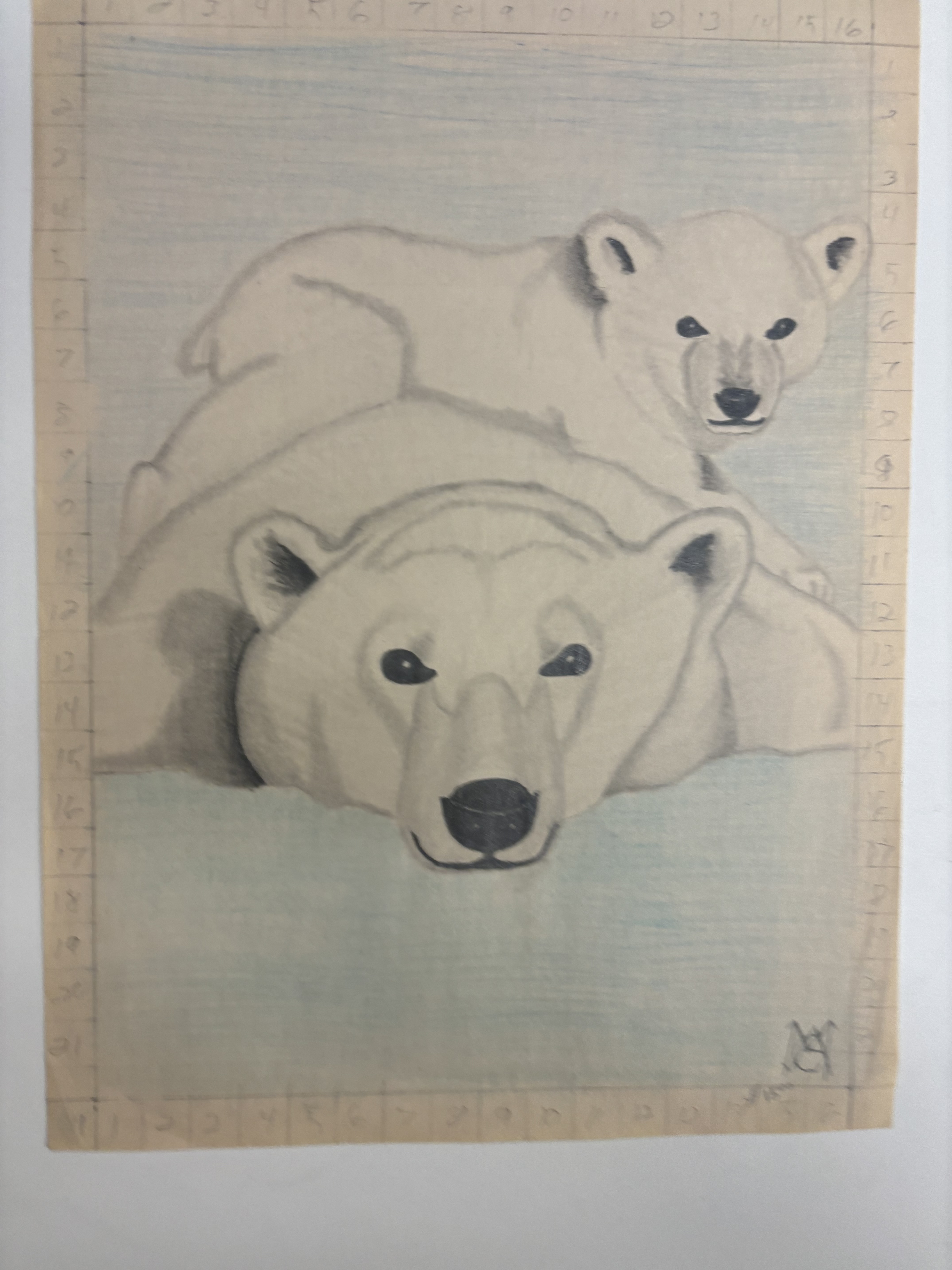 - a baby polar bear on top of an adult polar bear on a light blue background