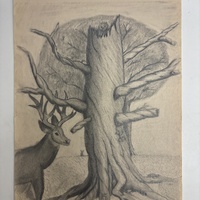 - tree stump with many small woodland animals in and around it including a deer in the bottom left corner
