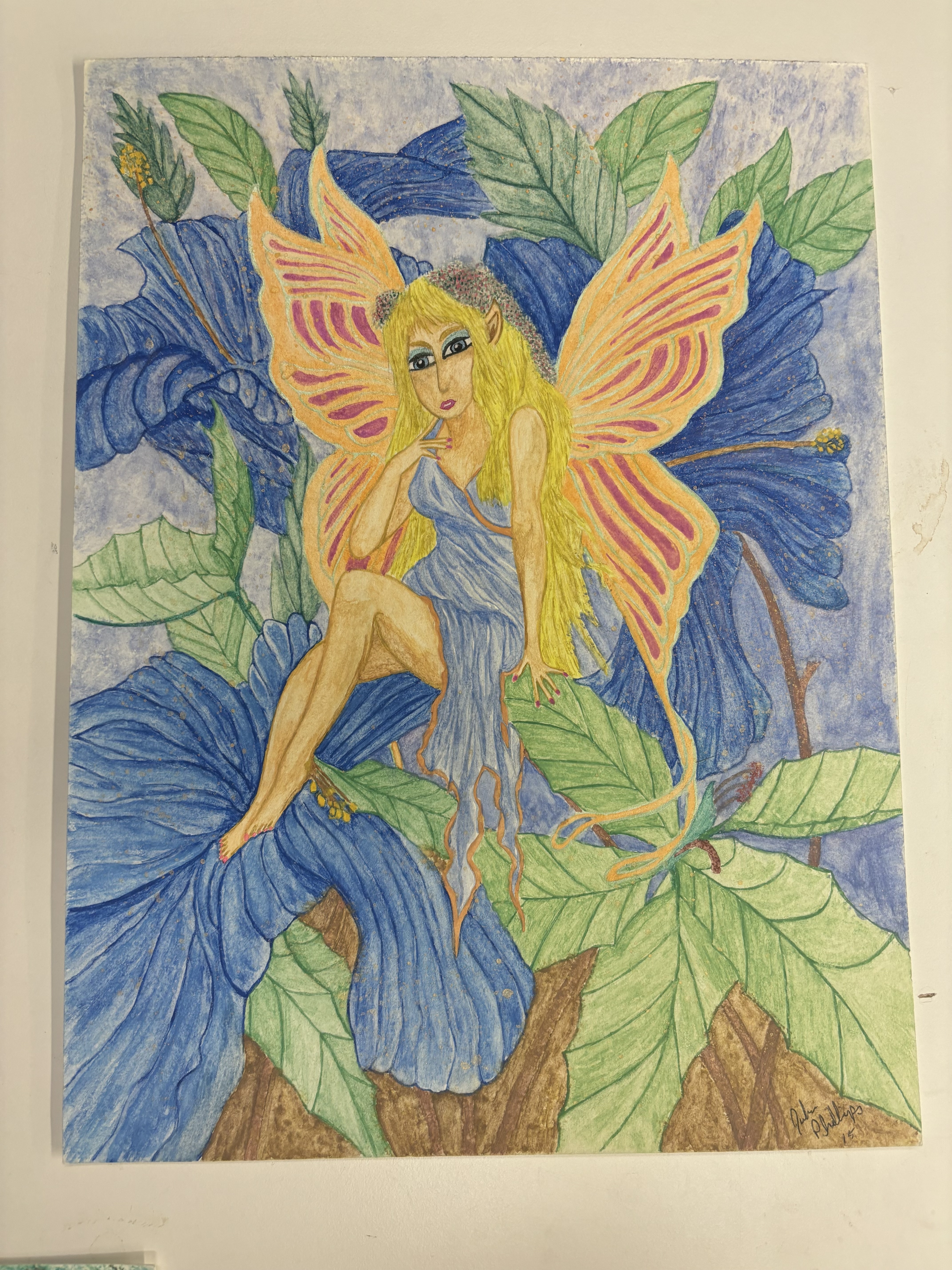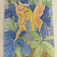 - blonde fairy in a blue dress with orange wings sitting on blue flowers