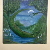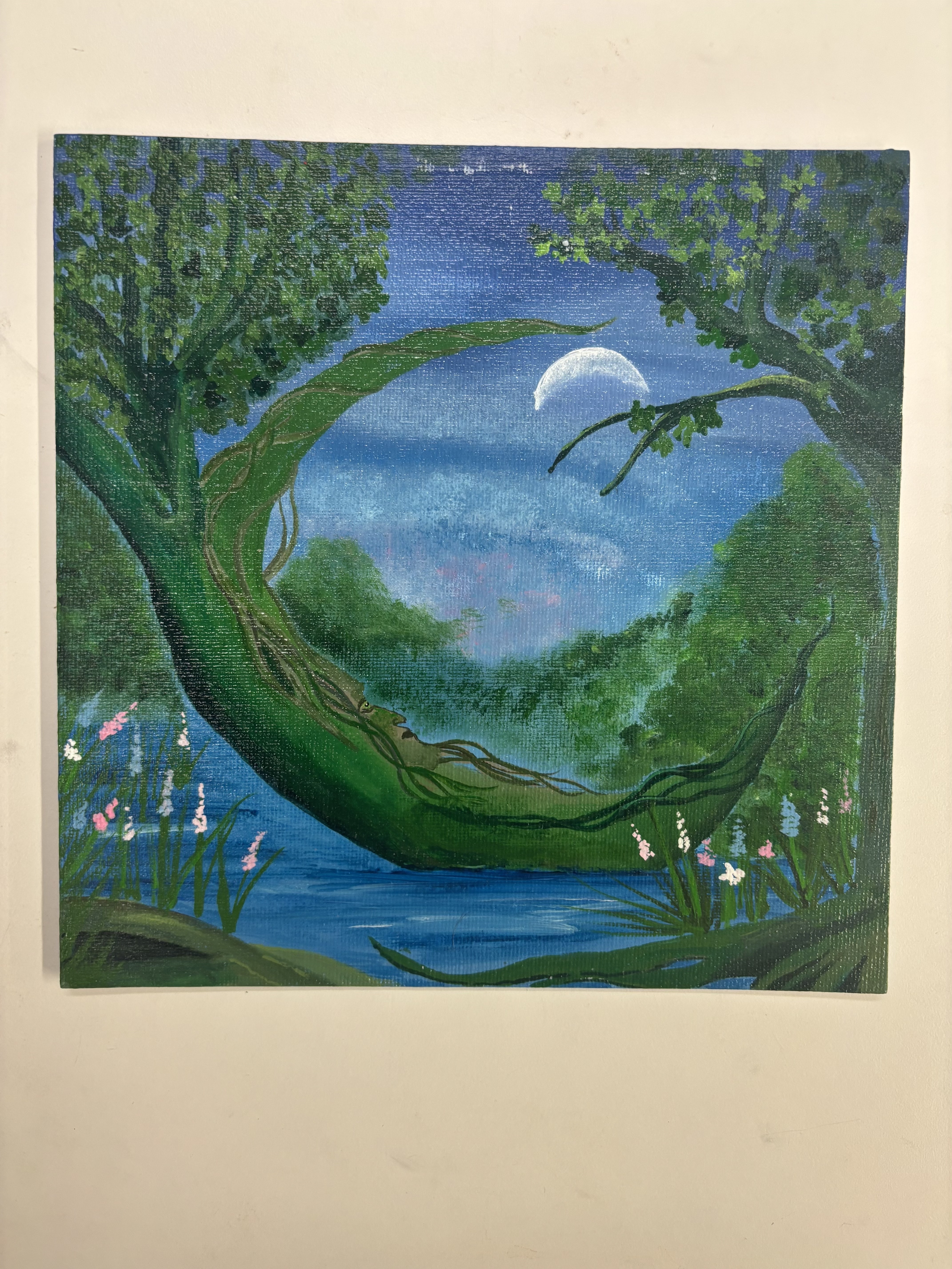 - a green being laying in green foliage on the water surrounded by trees below the moon