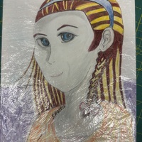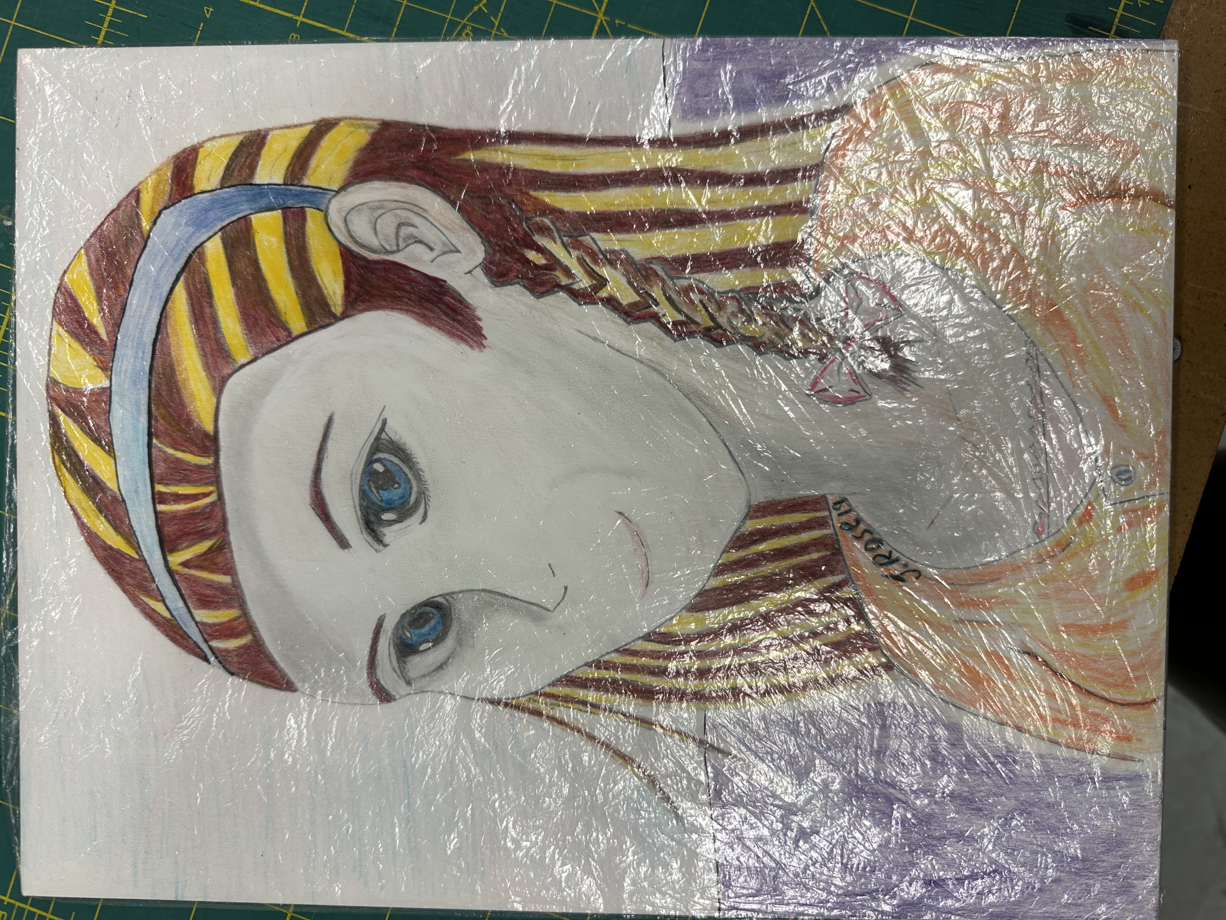 - A girl with red and yellow hair and a single braid who resembles mona lisa. In a cotton candy and purple background.