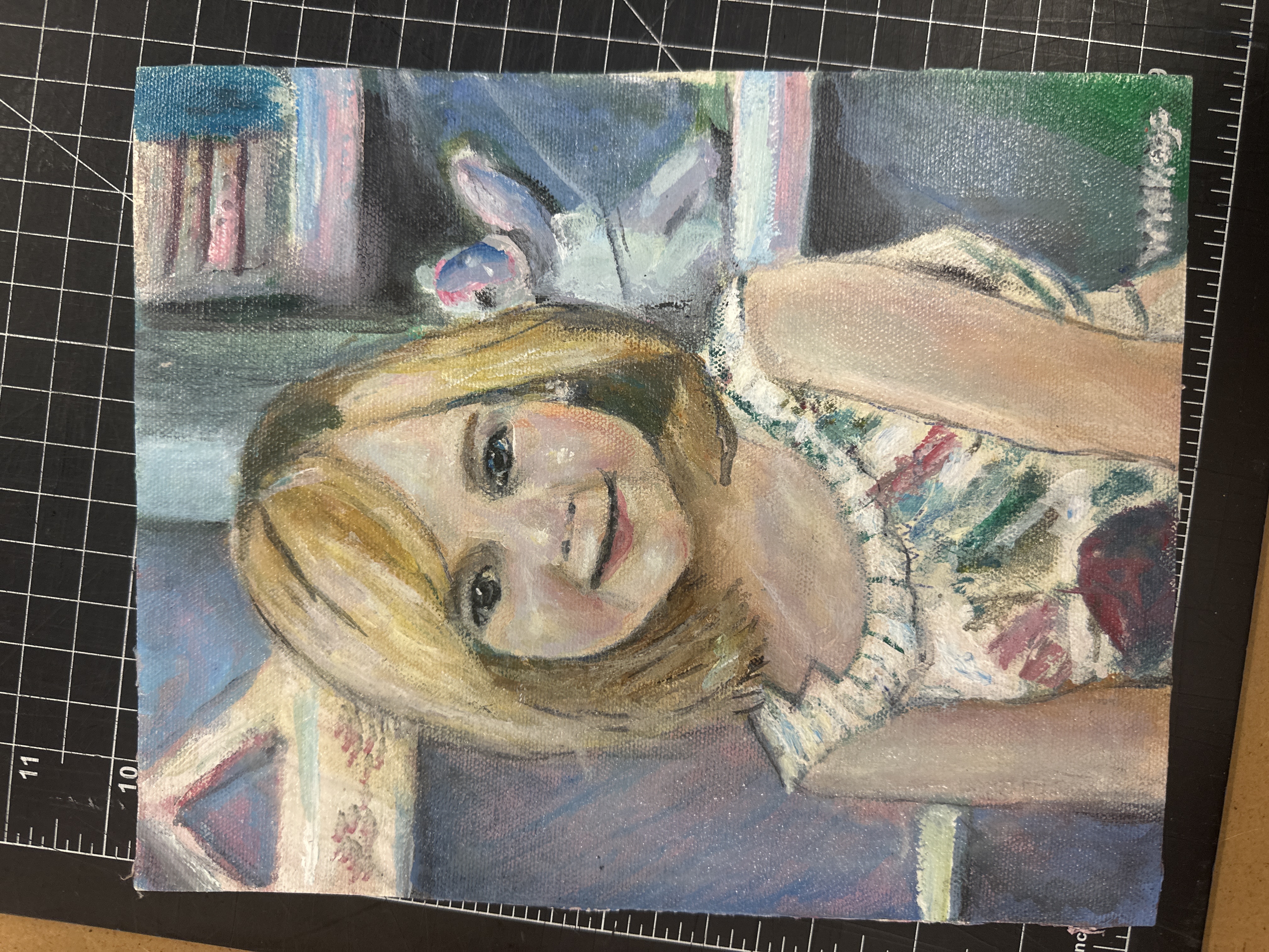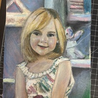 - A blonde little girl similing with a pastel blue and purple background and wearing a colorful shirt