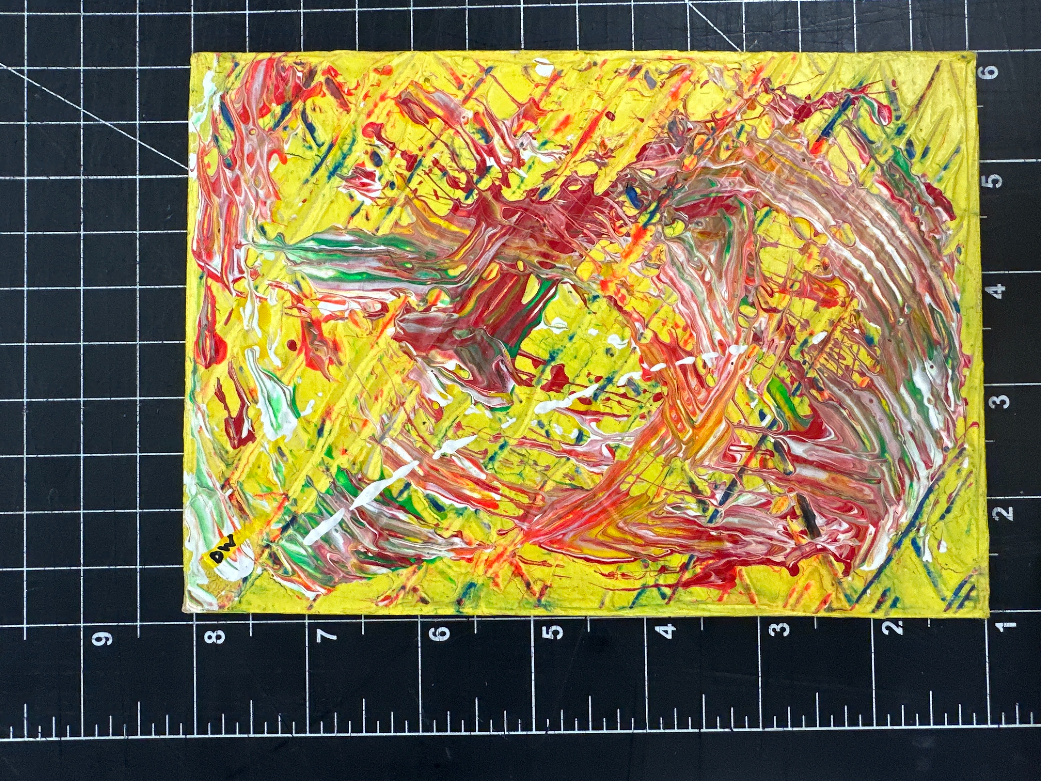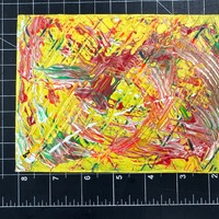- A yellow background with textured paint splatter consisting of red, greem , white and orange.