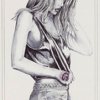 - A woman is standing sidewars facing the right, with her face tilted down she is looking up, and one hand is on her long straight hair, the other pulling at a sleeveless tank top. She is wearing tight jeans, a braided belt, and has a tattoo of a pair of lips biting somthing.